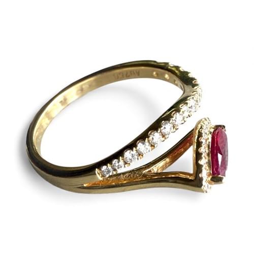 Anillo en oro amarillo de 18 quilates con un diseño envolvente y elegante. La pieza centra su atención en un rubí natural corte marquise, montado con dos garras y rodeado por un delicado halo de diamantes corte brillante.