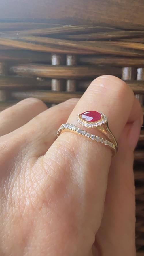 La combinación del rubí marquise con el doble brazo diamantado crea una estética moderna, femenina y muy fina.