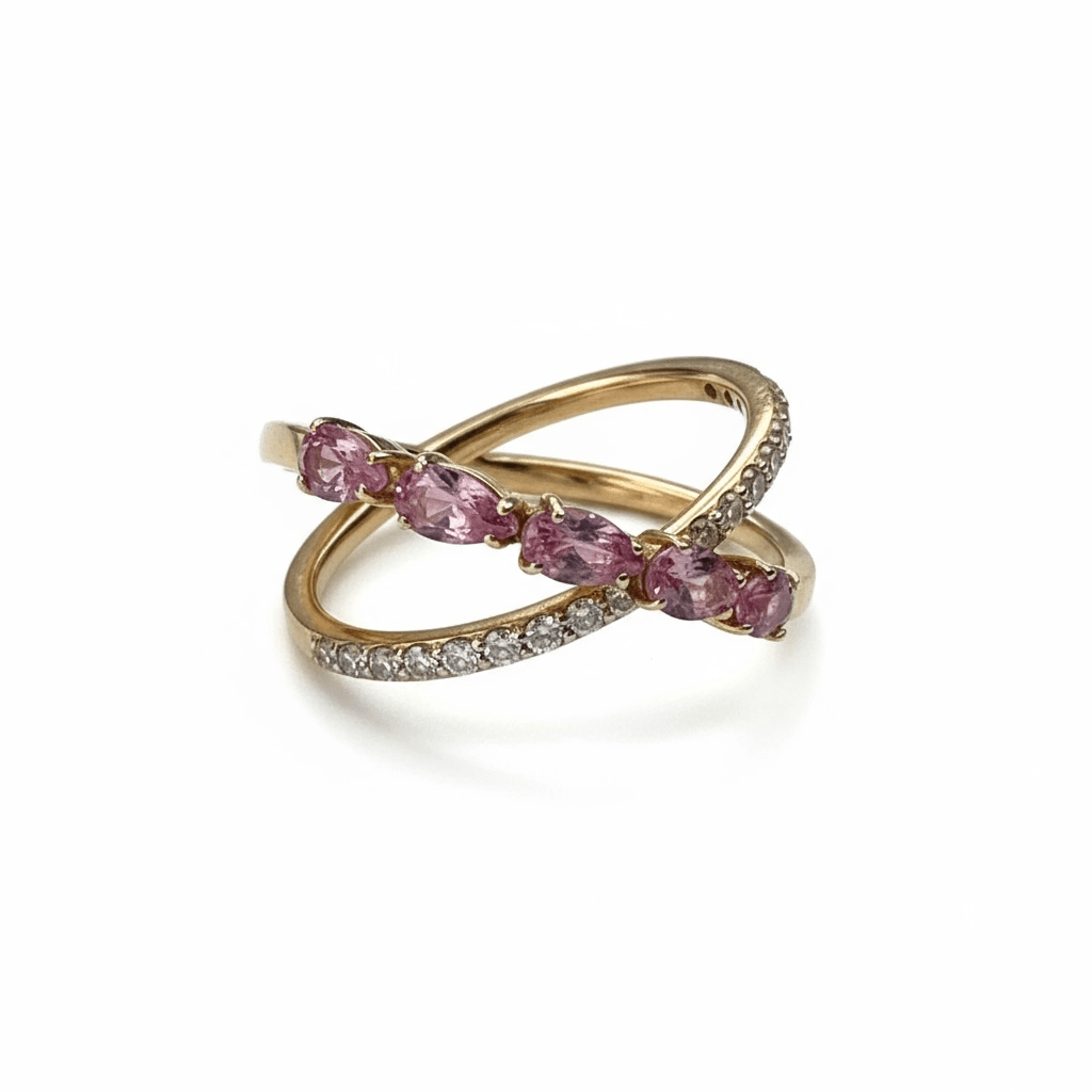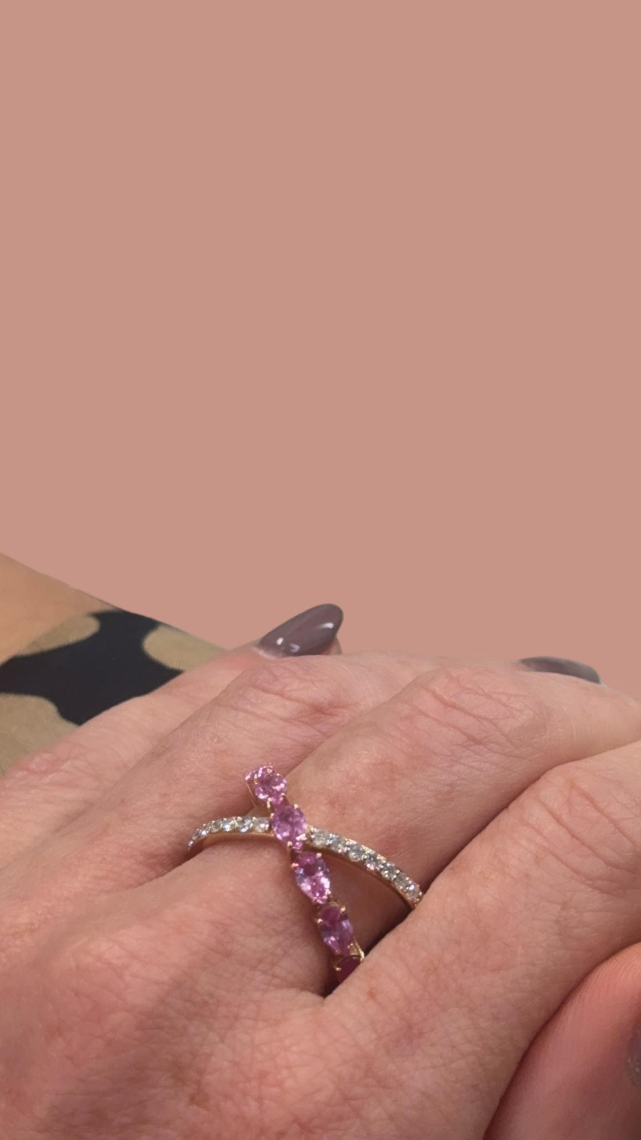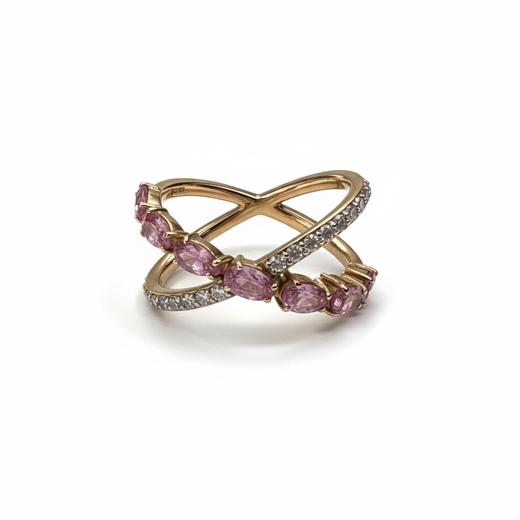 Un diseño entrelazado que fusiona elegancia y dulzura. Elaborado en oro rosa de 18K, este anillo presenta dos bandas que se cruzan en un delicado abrazo: una línea de zafiros rosas en corte pera y otra engastada con brillantes diamantes blancos. Su silueta tipo X o “criss-cross” simboliza la unión, el equilibrio y el amor eterno. Ideal para añadir un toque romántico y sofisticado a cualquier look.