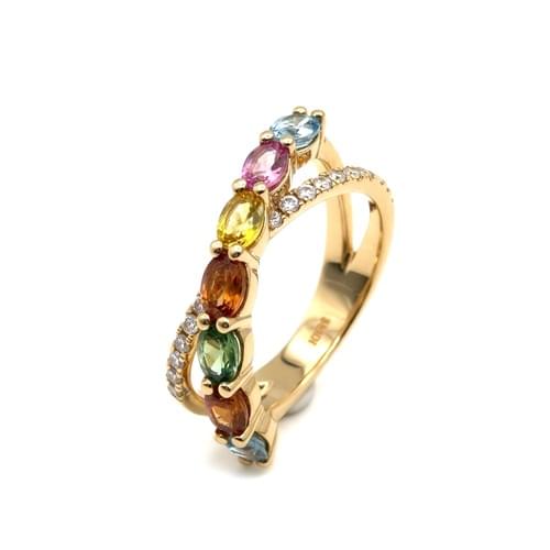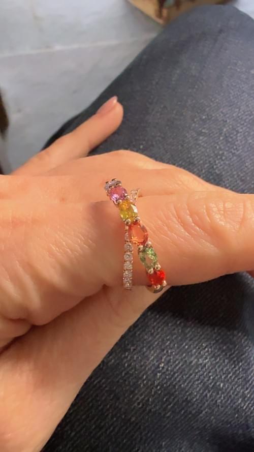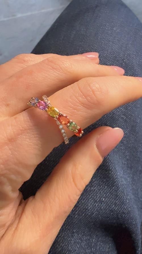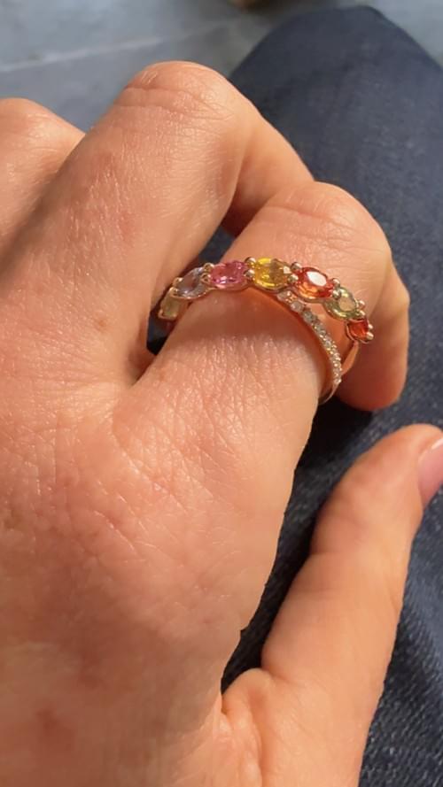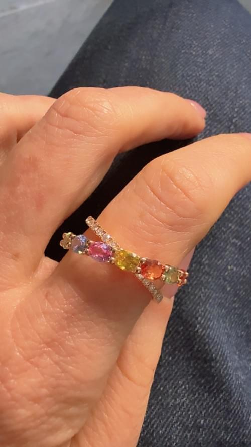 Anillo de oro rosa de 18K con diseño elegante y contemporáneo, protagonizado por una hilera de zafiros multicolor que crean un efecto arcoíris sofisticado. Cada piedra está engastada en montura de garras que permite el paso de la luz y realza su brillo natural.