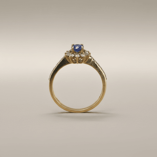 La montura en oro amarillo realza la intensidad del zafiro, mientras que el aro delicadamente pavé de diamantes añade un brillo continuo que eleva la pieza con elegancia y sofisticación.