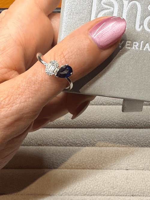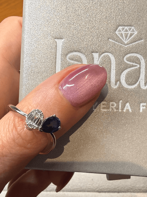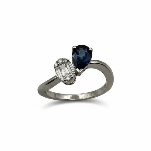 Este sofisticado anillo en oro blanco presenta un profundo zafiro azul corte pera, engastado en garras que realzan su intensidad y brillo natural.