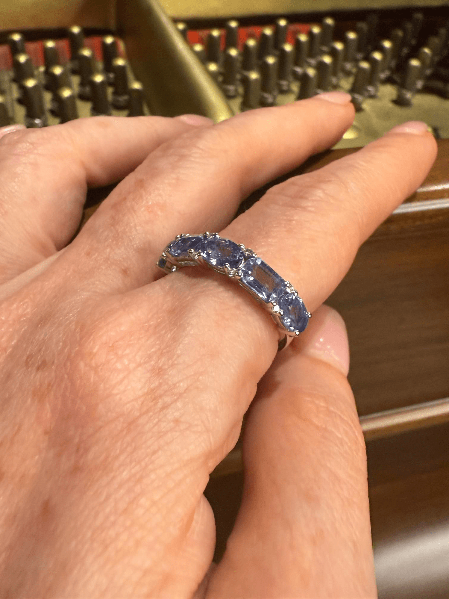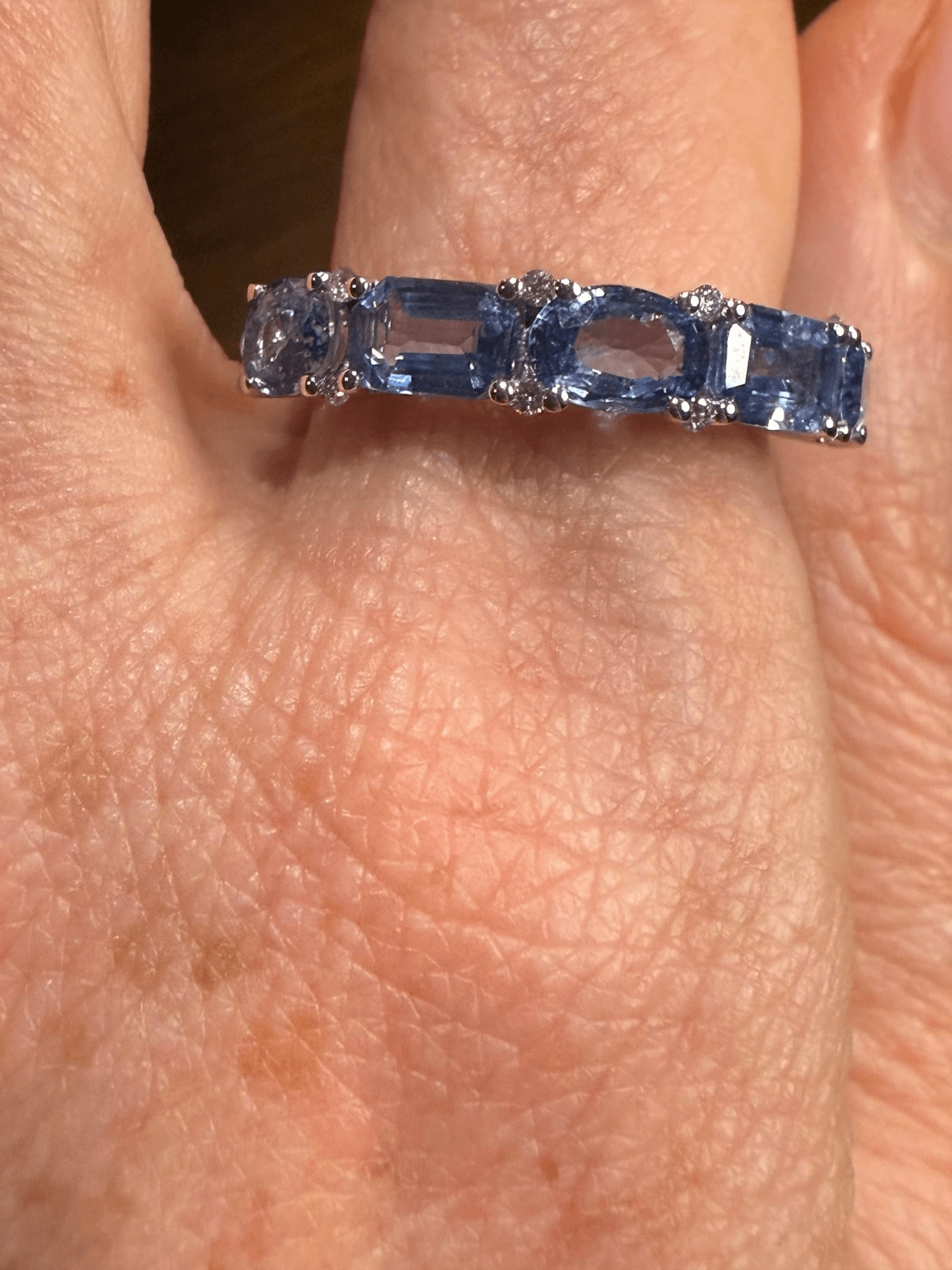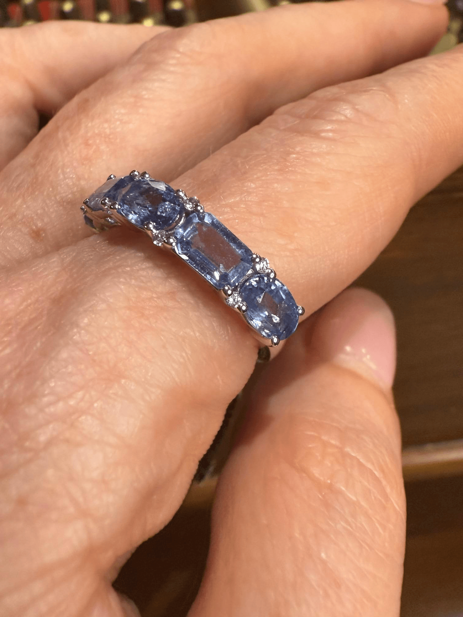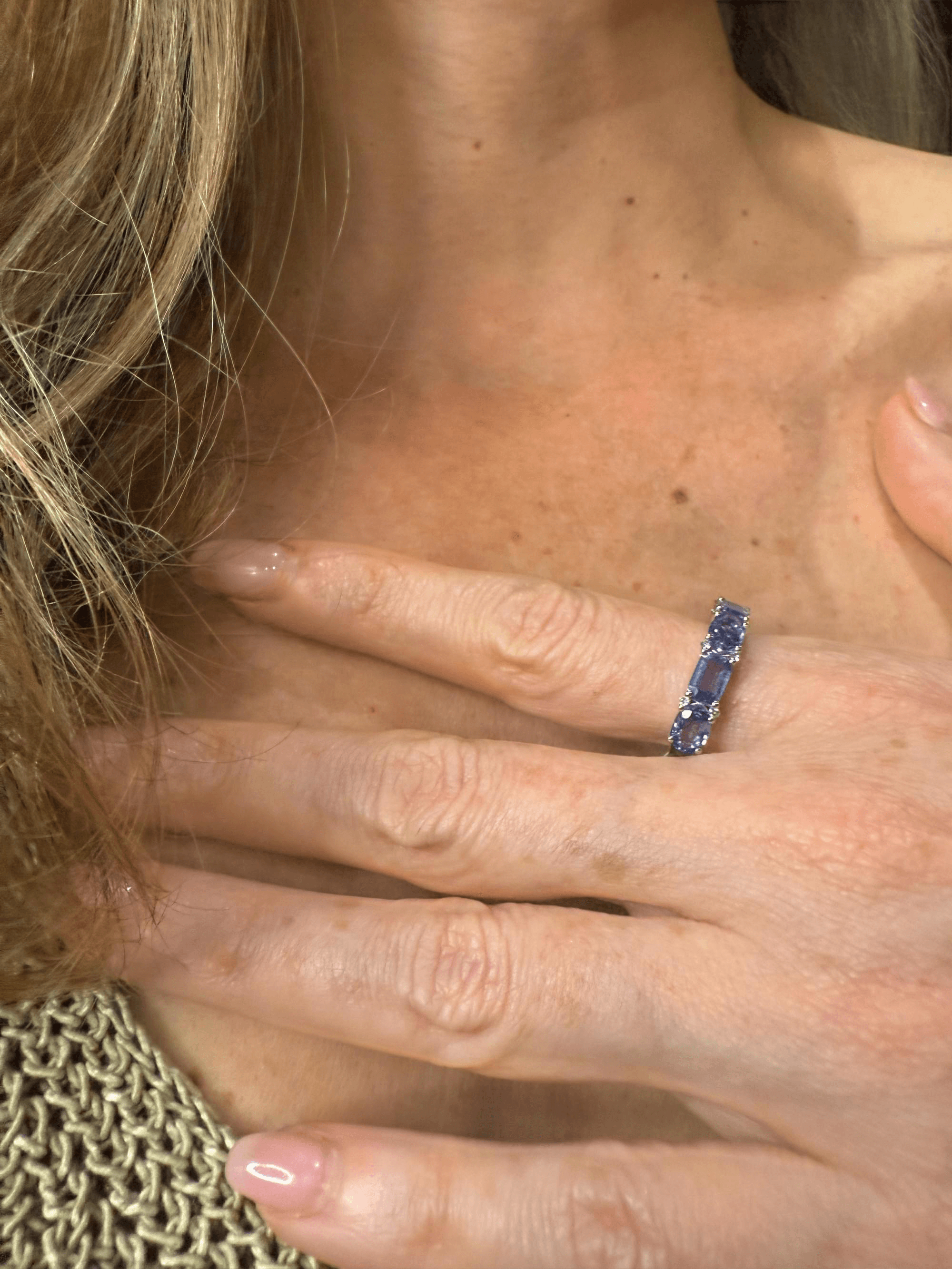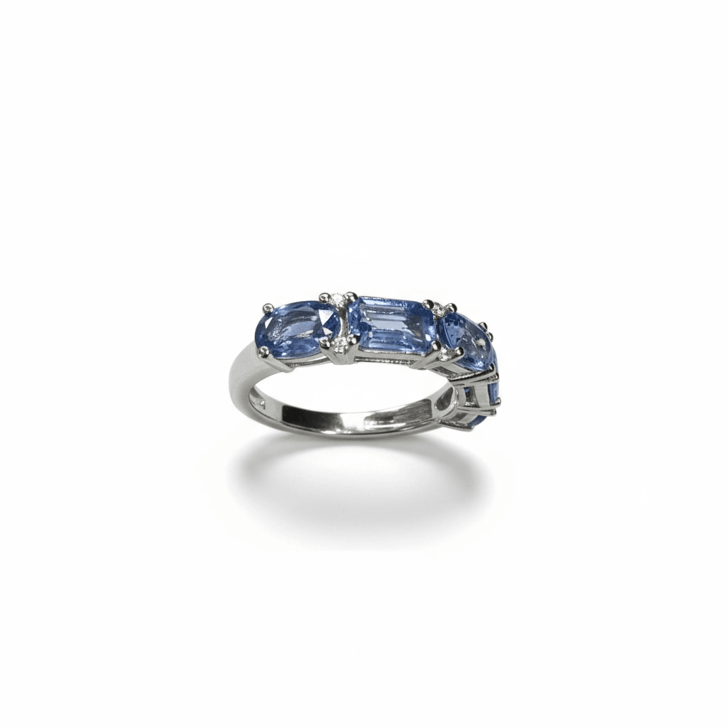 Anillo en oro blanco de 14 quilates con un diseño lineal de cinco zafiros azul cielo en cortes oval y esmeralda, intercalados por sutiles diamantes que aportan un destello de luz y elegancia. Cada piedra, cuidadosamente engastada en garras, refleja serenidad y sofisticación, evocando el brillo limpio y etéreo de un cielo despejado. Una pieza ideal para quienes buscan color, armonía y distinción en una joya atemporal.