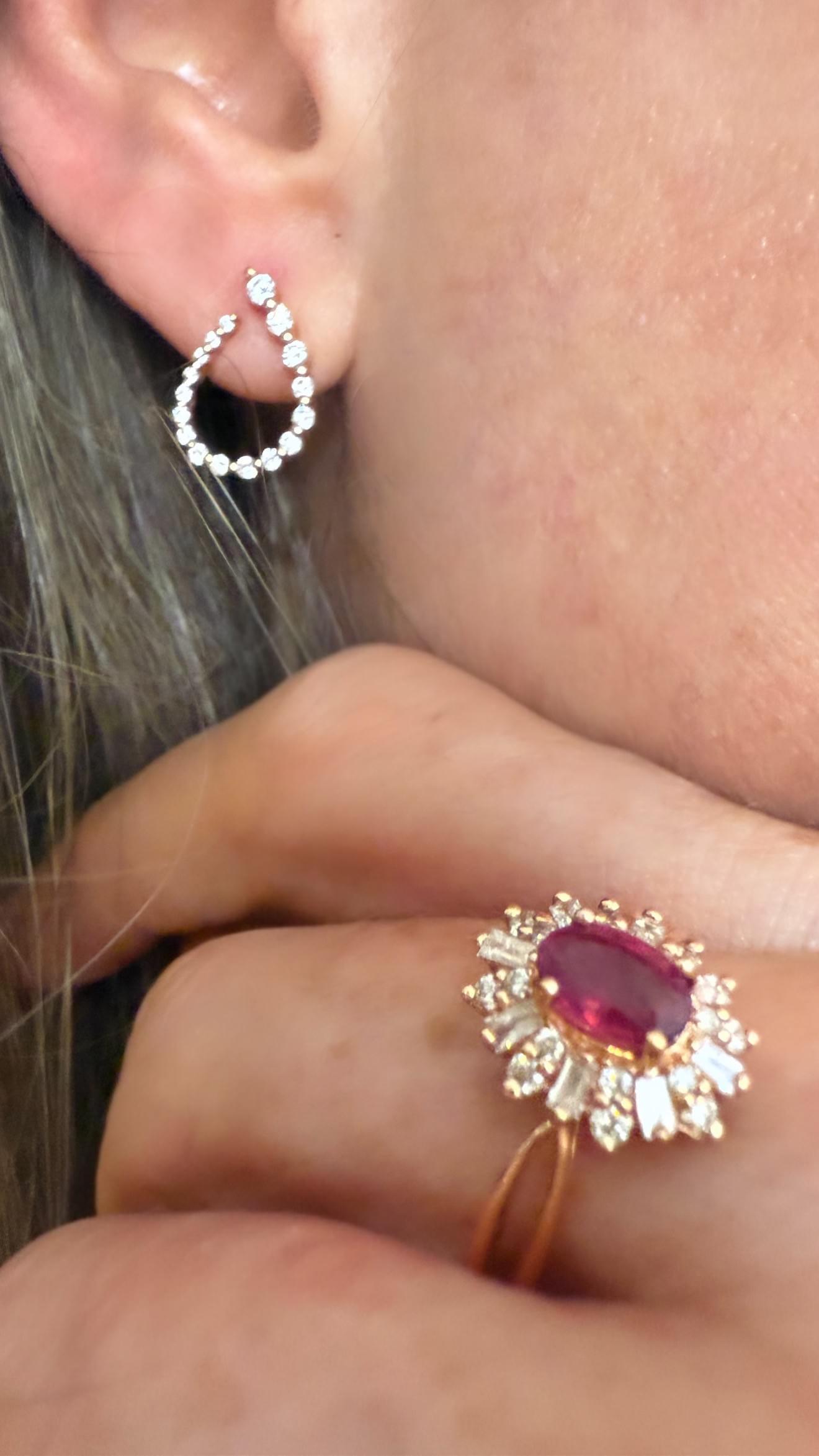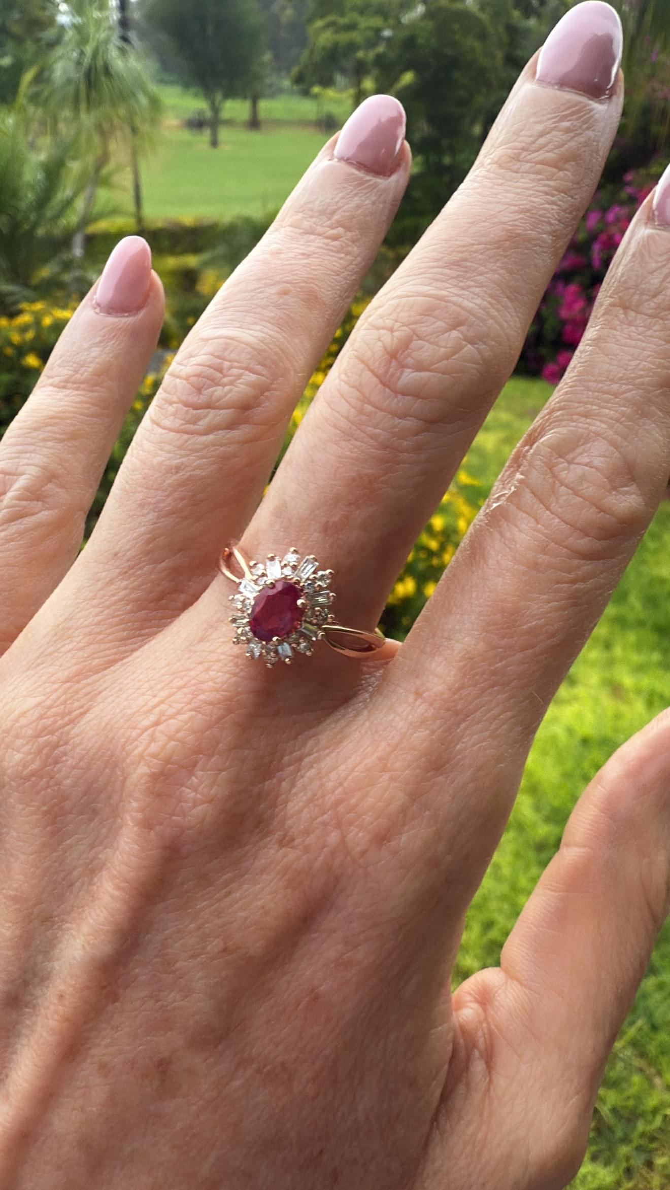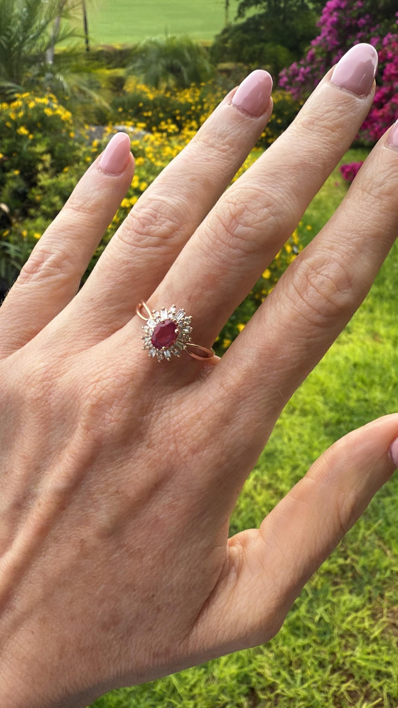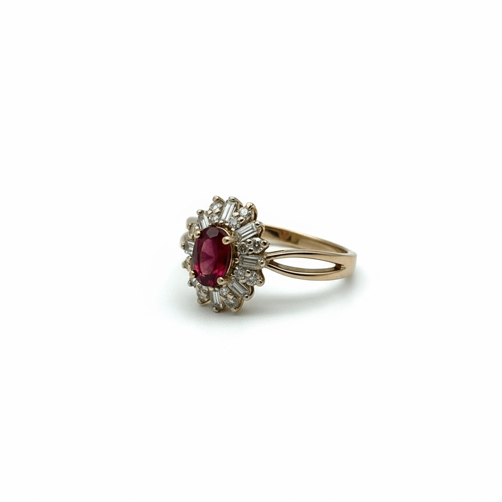 Elegante anillo en oro rosa con un rubí central ovalado, rodeado por un halo de diamantes en corte baguette y brillante, creando un resplandor similar a los rayos del sol, el diseño combina distinción y luminosidad.