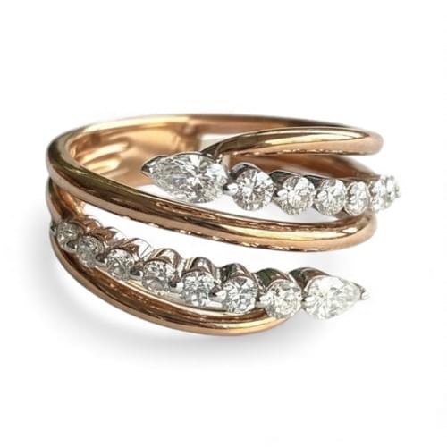 En los extremos del diseño, dos diamantes corte pera miran en direcciones opuestas, creando un efecto de movimiento y armonía que estiliza el dedo. El contraste del oro rosa con el destello blanco de los diamantes hace que sea una pieza ideal para quienes buscan una joya fina, moderna y distintiva, perfecta para uso diario o ocasiones especiales.