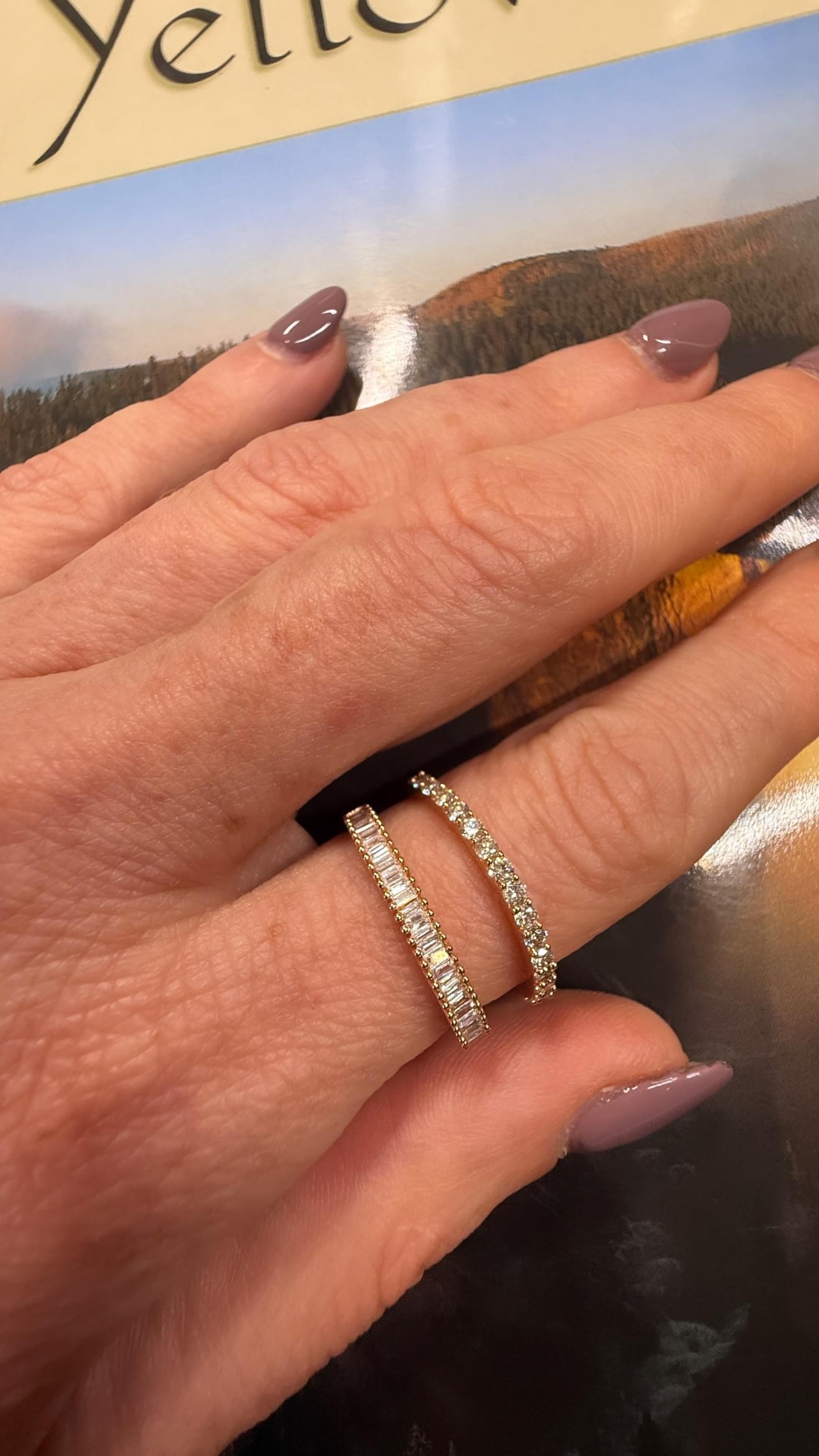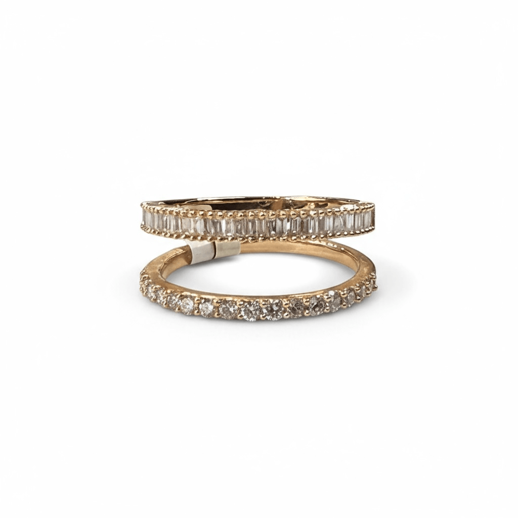 La banda superior presenta diamantes corte baguette engastados en canal, creando un efecto geométrico y sofisticado; mientras que la banda inferior brilla con diamantes redondos corte brillante en engaste pavé, aportando destellos clásicos y un brillo intenso.