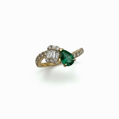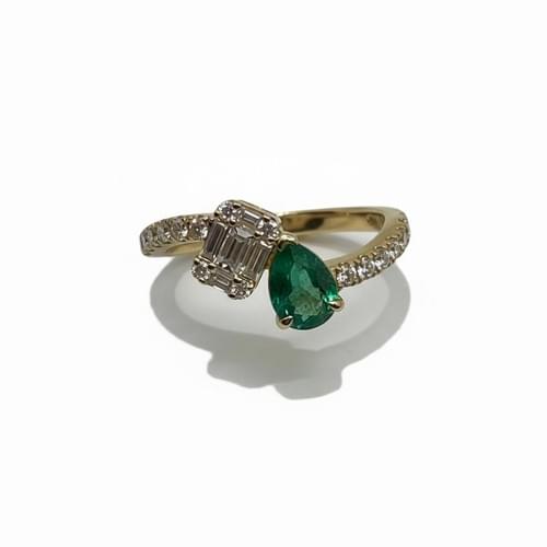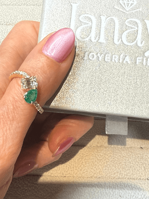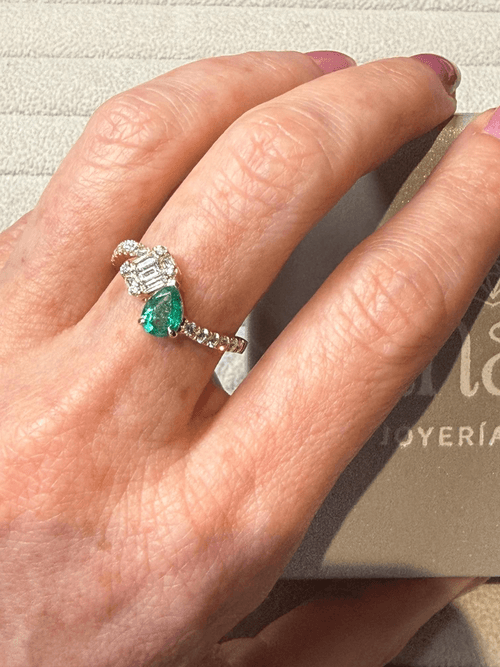 Anillo elaborado en oro amarillo que fusiona elegancia y modernidad en un diseño tipo bypass. Presenta una vibrante esmeralda natural en corte pera, sostenida por finas garras que resaltan su color verde intenso y profundidad visual.