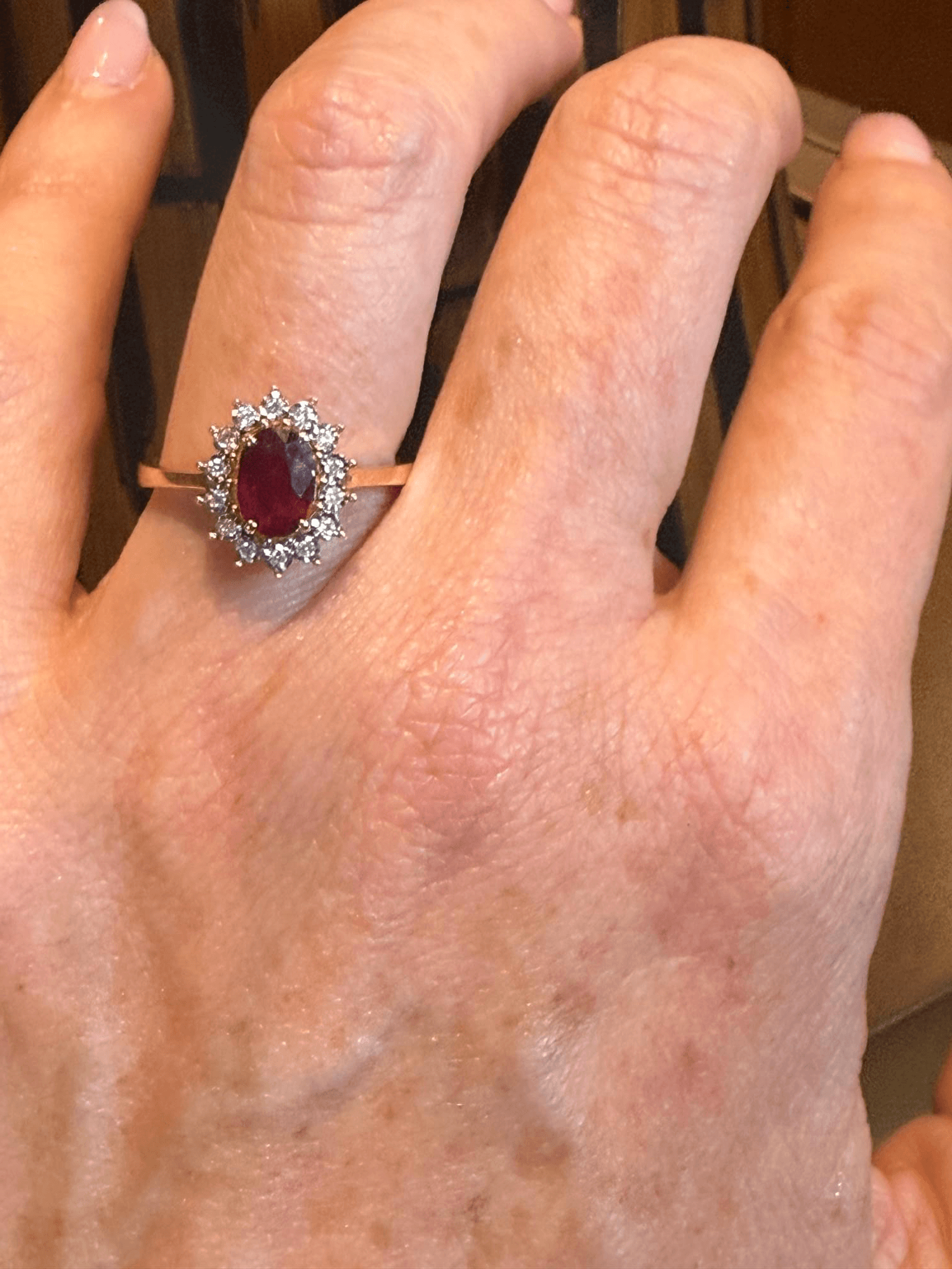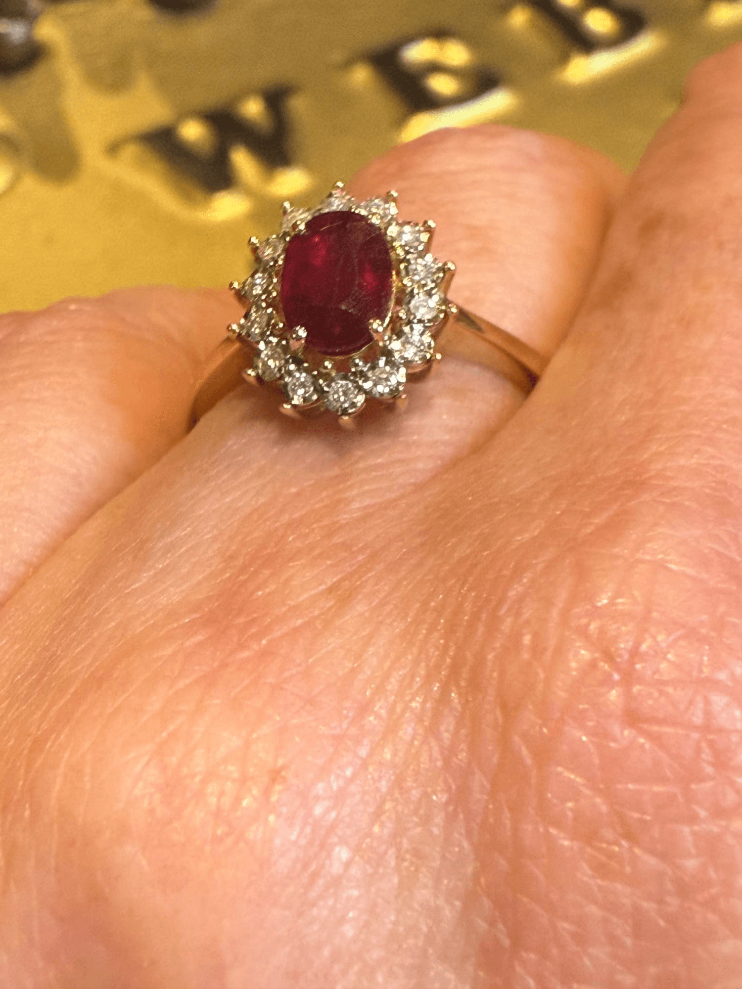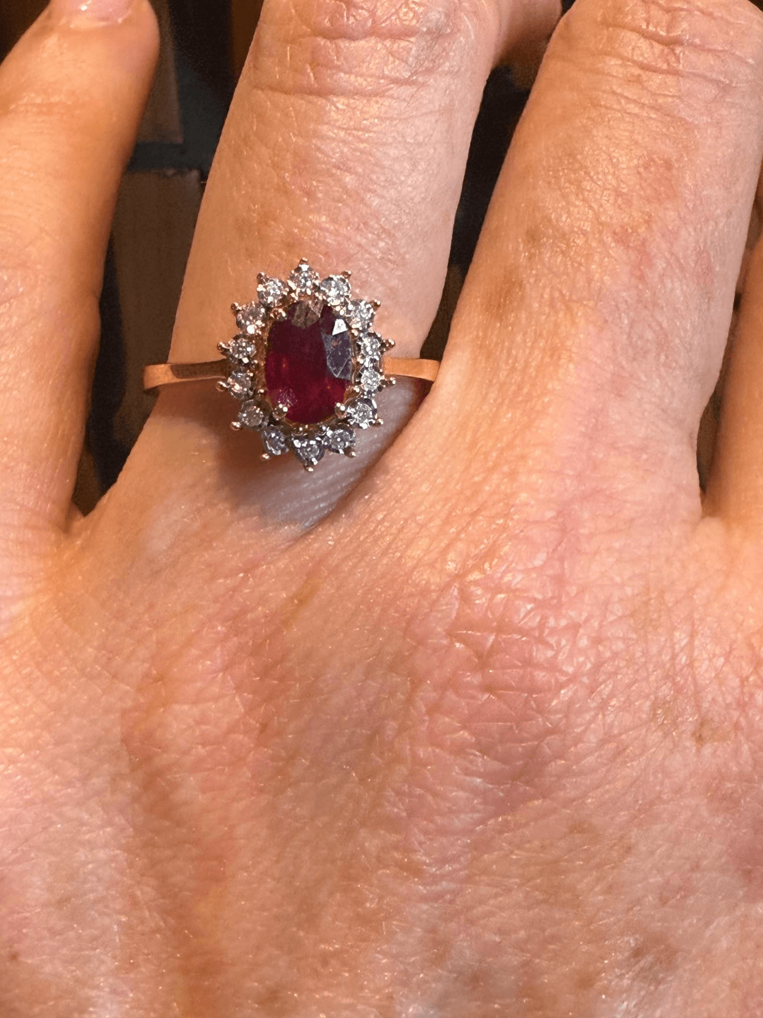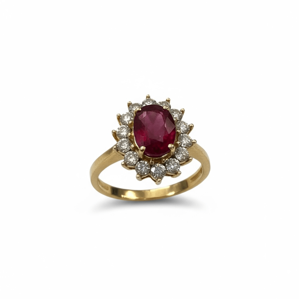 Este majestuoso anillo presenta un rubí natural corte oval, de intenso tono carmesí, engastado en el centro de una deslumbrante corona de diamantes redondos brillantes. Su diseño tipo halo clásico resalta la riqueza y profundidad del rubí, mientras los diamantes que lo rodean amplifican su brillo con una armoniosa simetría. Montado en oro amarillo de 14 quilates, combina la calidez del metal con la pasión del rubí y el resplandor eterno del diamante.