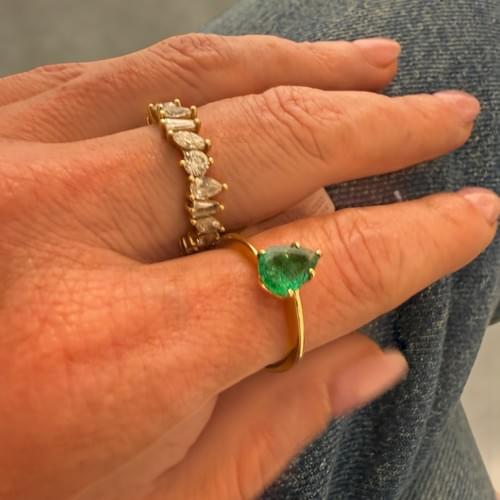 Anillo de diseño minimalista protagonizado por una esmeralda natural en corte pera, que destaca por su intenso tono verde y su brillo profundo. La piedra se eleva delicadamente sobre una montura de cuatro garras, permitiendo el paso de la luz y realzando la belleza natural de la gema. El aro delgado en oro amarillo aporta un acabado limpio y sofisticado, ideal para quienes buscan una joya fina, elegante y atemporal. Perfecto para uso diario, layering o como pieza central con carácter sutil.