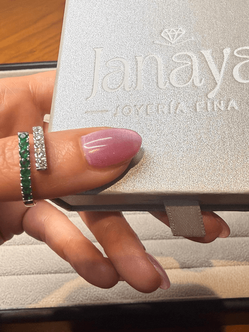 Un brazo engastado con esmeraldas naturales en corte redondo de intenso verde profundo, y el otro brazo con diamantes naturales en corte brillante, creando un contraste sofisticado y luminoso.