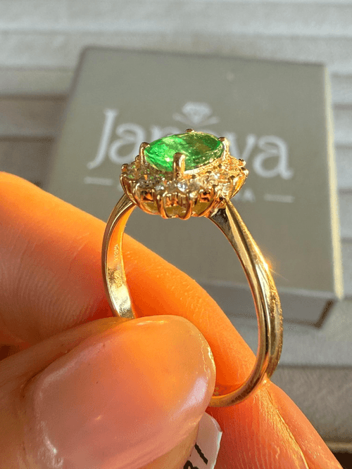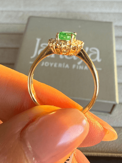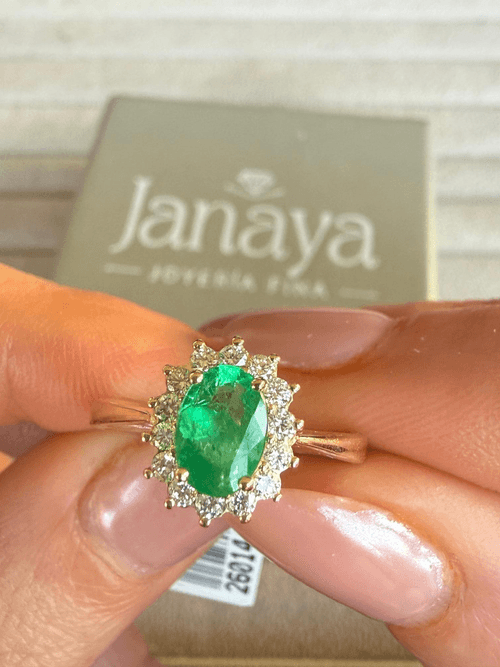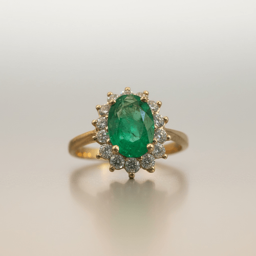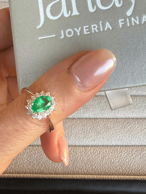 Elegante anillo de alta joyería que resalta una esmeralda natural de intenso color verde en corte oval, cuidadosamente montada en garras. La piedra central se enmarca con un delicado halo de diamantes corte brillante que realzan su luminosidad y profundidad, creando un contraste sofisticado y atemporal.