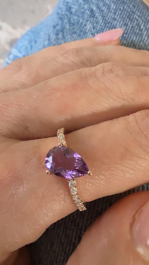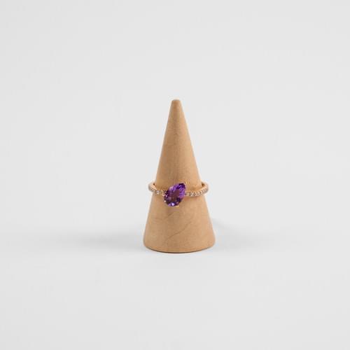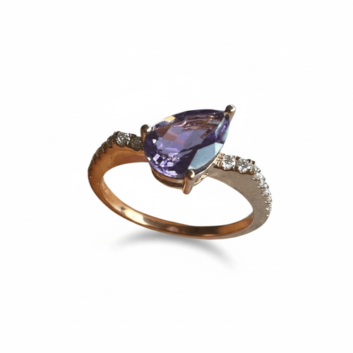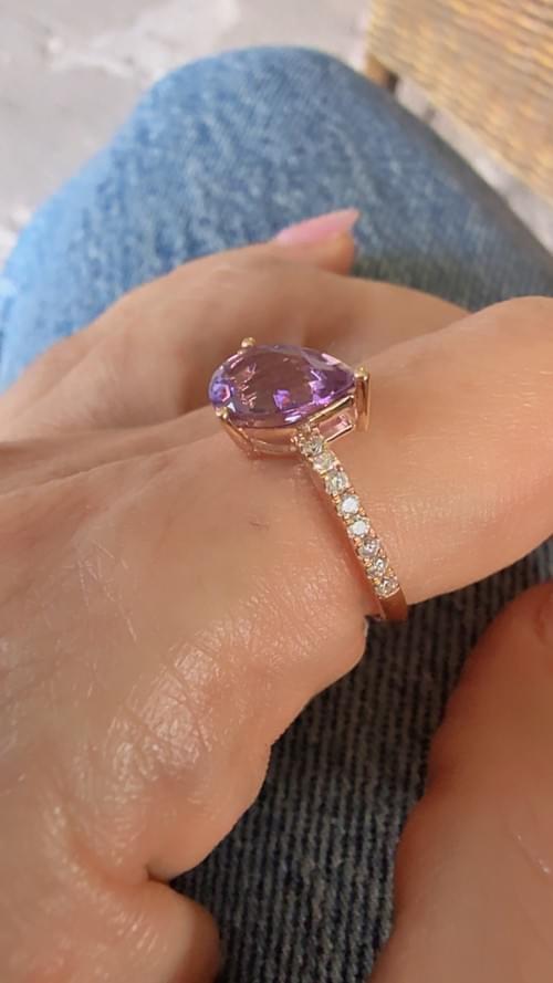 Anillo en oro rosa de 18K con una elegante amatista corte pera, montada en orientación vertical y sostenida por tres garras delicadas. La banda está pavimentada con diamantes corte brillante que aportan un brillo sutil y refinado, creando un contraste perfecto con el tono lavanda de la piedra central.