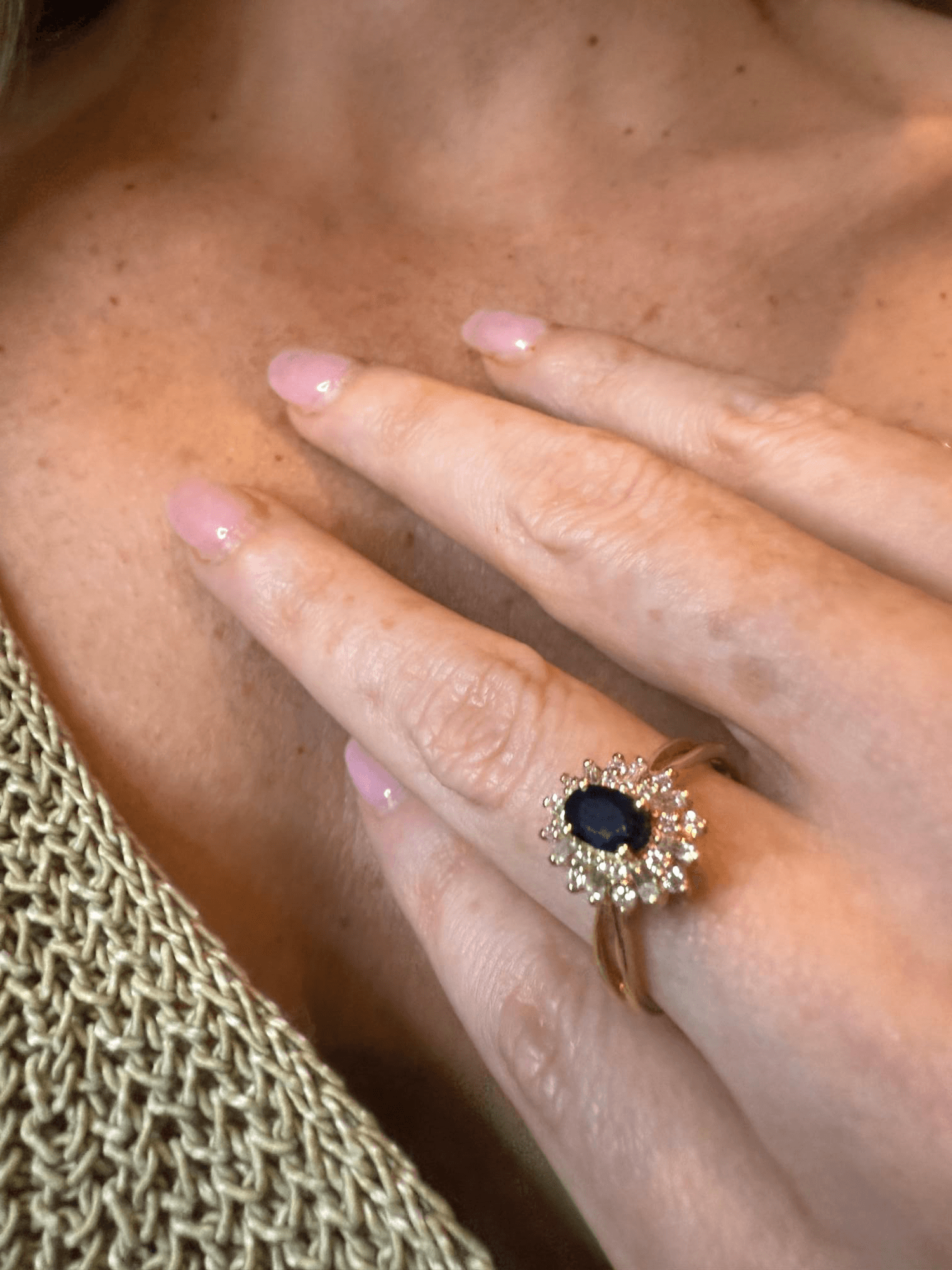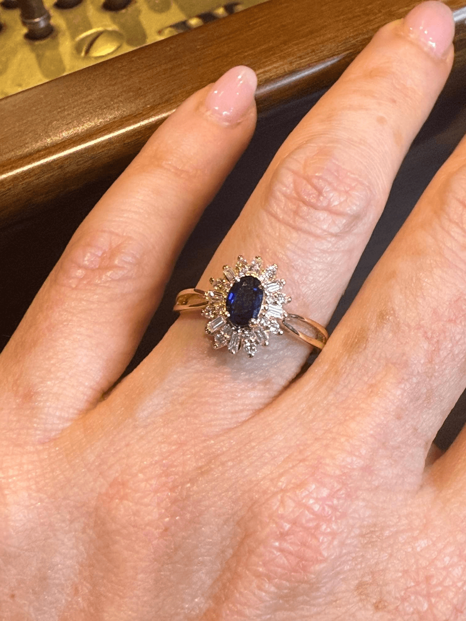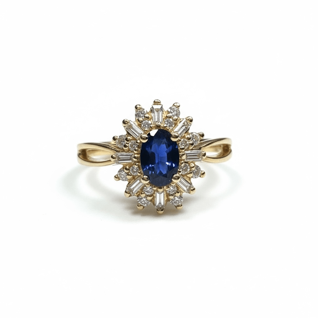 Un diseño majestuoso que evoca elegancia atemporal. Este anillo presenta un zafiro azul intenso con corte ovalado, enmarcado por un halo de diamantes que alternan cortes baguette y brillante redondo, creando un efecto de resplandor tipo estrella. Montado en oro amarillo, su combinación de tonos cálidos y fríos resalta la profundidad del zafiro central y el brillo impecable de los diamantes.