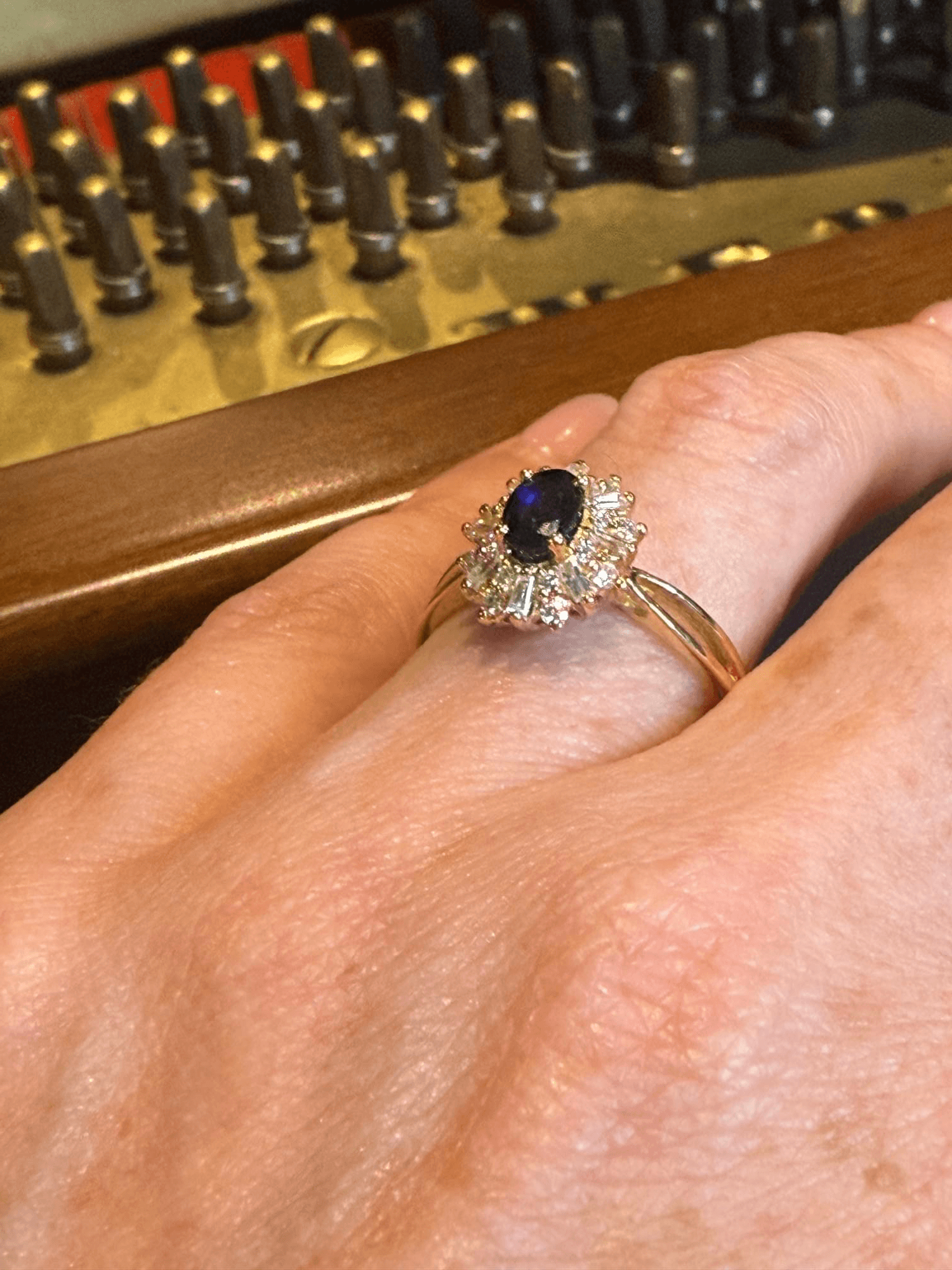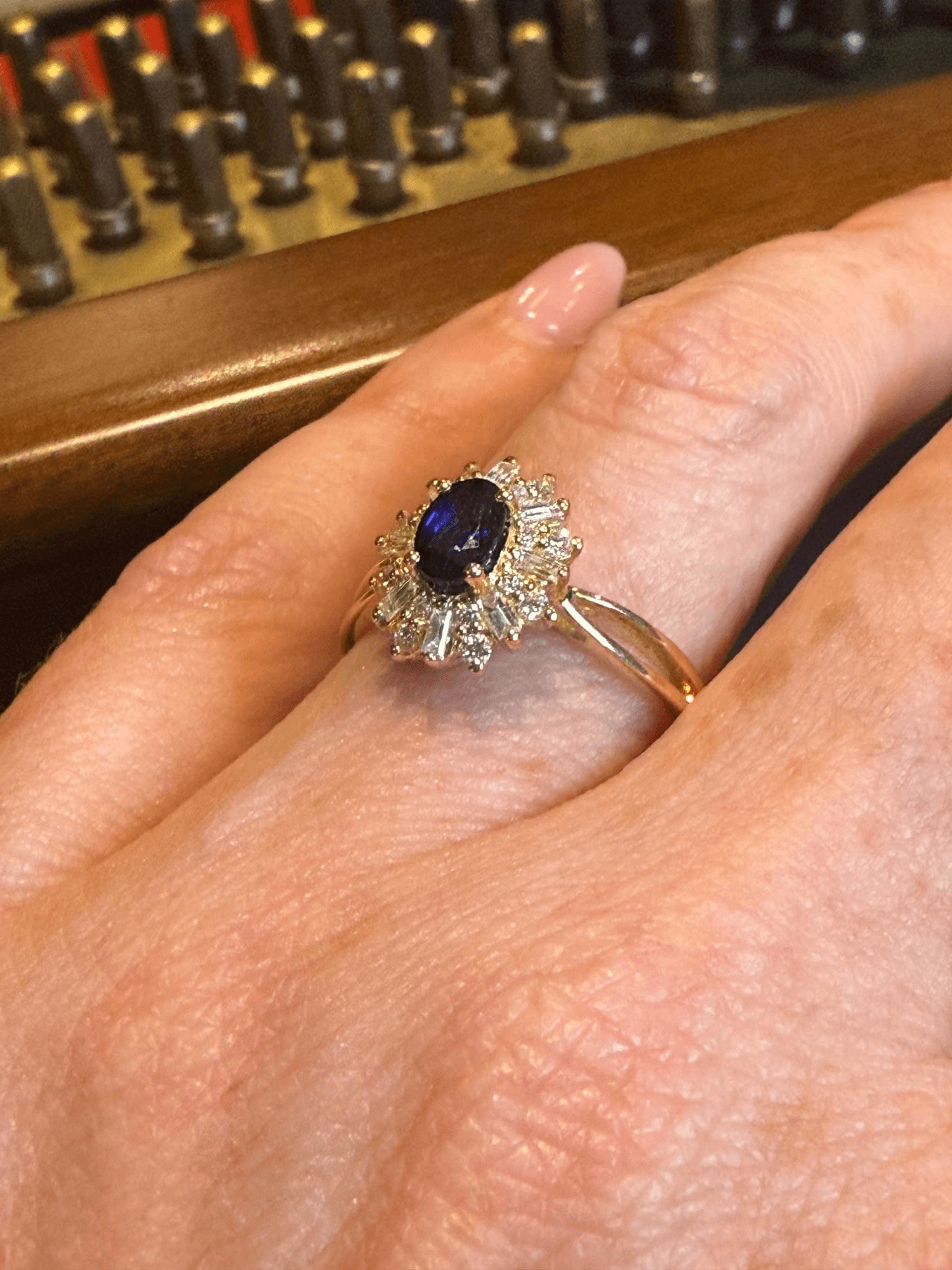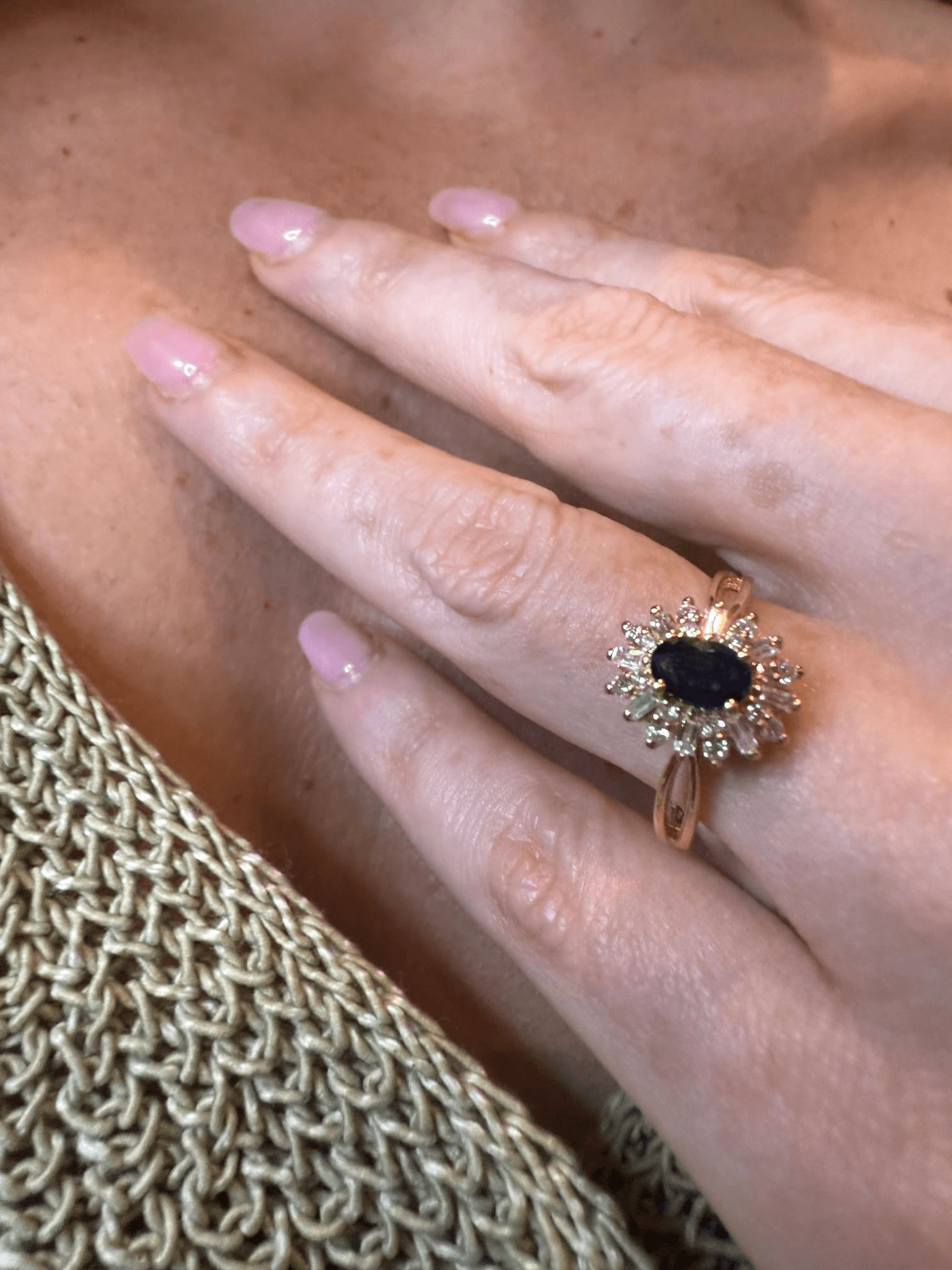 Un diseño majestuoso que evoca elegancia atemporal. Este anillo presenta un zafiro azul intenso con corte ovalado, enmarcado por un halo de diamantes que alternan cortes baguette y brillante redondo, creando un efecto de resplandor tipo estrella. Montado en oro amarillo, su combinación de tonos cálidos y fríos resalta la profundidad del zafiro central y el brillo impecable de los diamantes.
