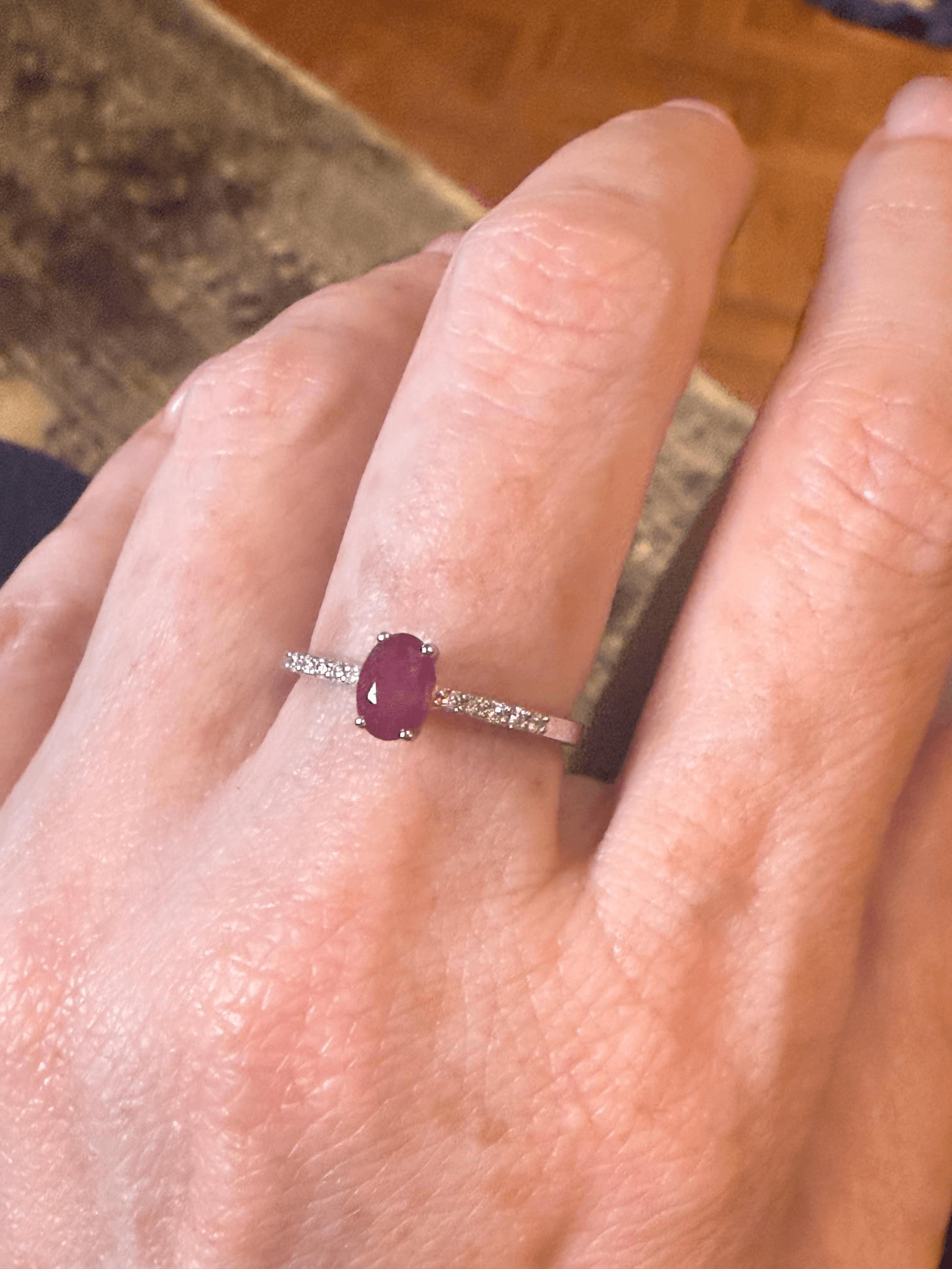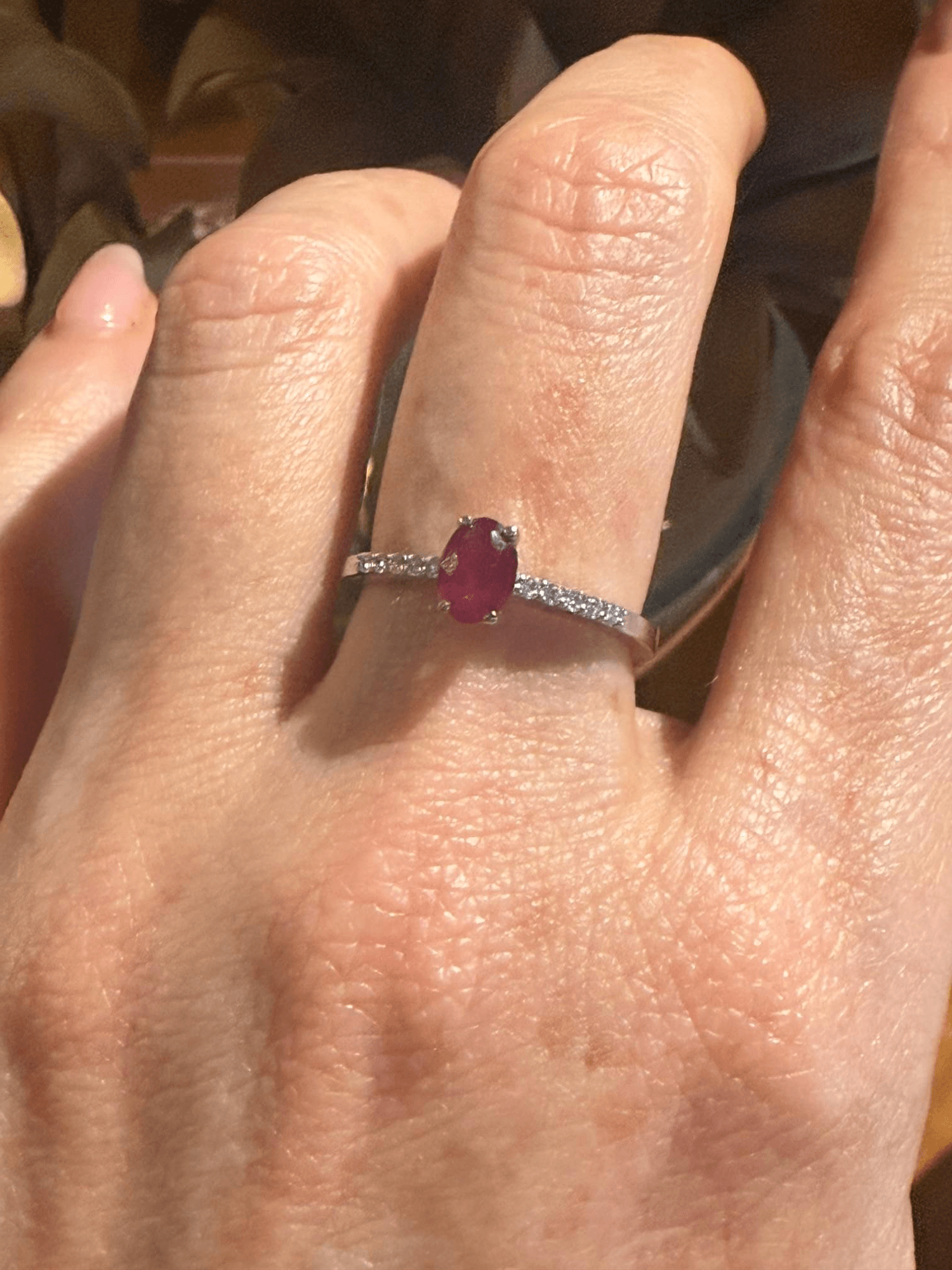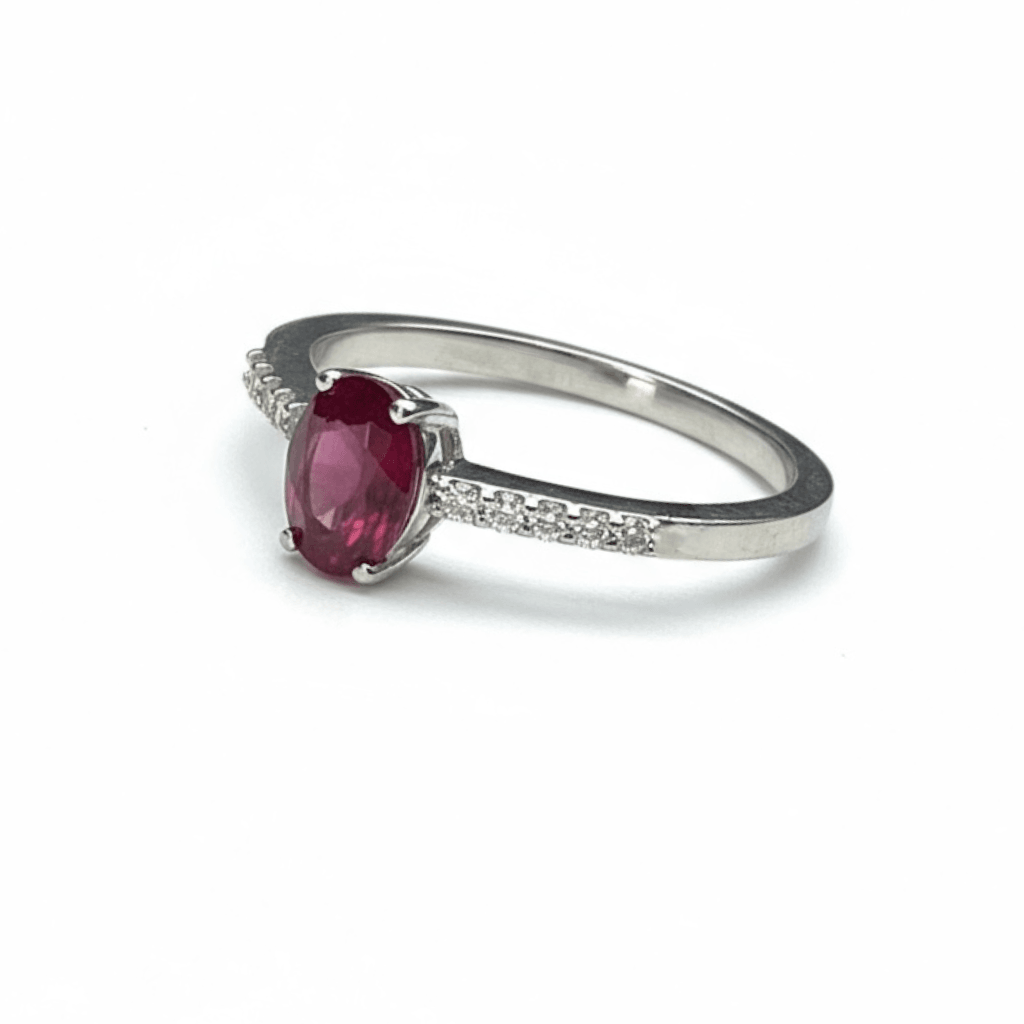 Elegante anillo de oro blanco con un rubí central de intenso tono carmín, engastado en cuatro garras que realzan su brillo y profundidad. Los laterales del aro están delicadamente adornados con una hilera de diamantes en pavé, aportando un toque de luz que enmarca la piedra principal con sutileza y sofisticación. Un diseño clásico y refinado, ideal para quienes buscan una joya atemporal con un destello de color apasionado.