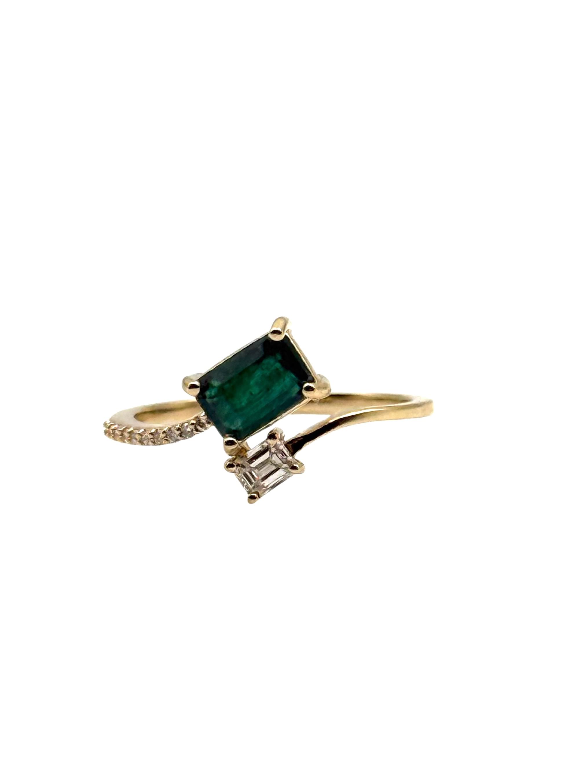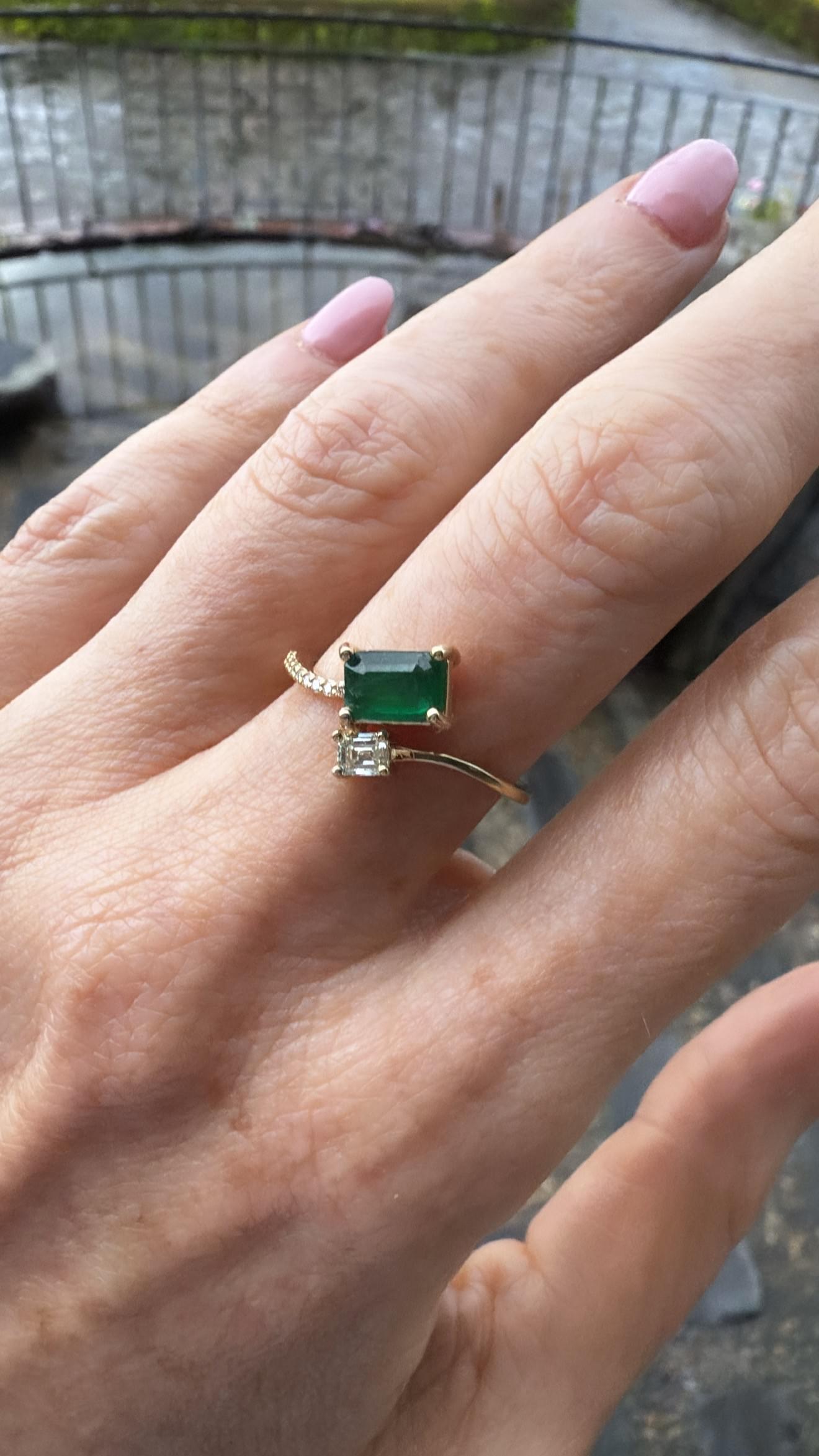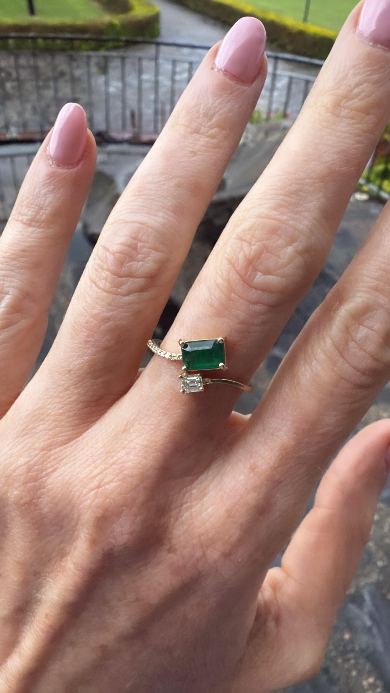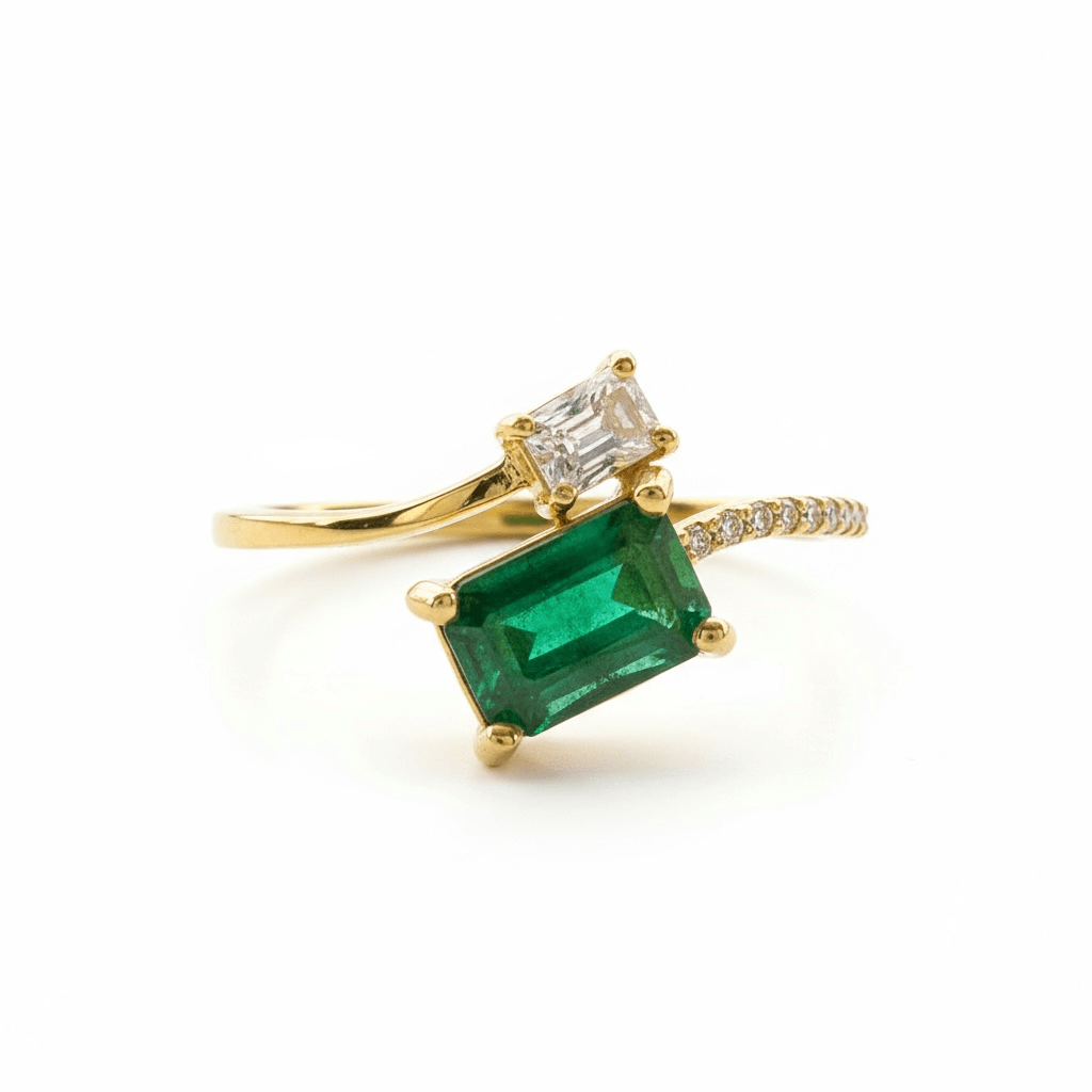 Anillo tú y yo en oro amarillo. Combina la intensidad de una esmeralda rectangular con la elegancia de un diamante cuadrado, creando un contraste sofisticado y moderno. La montura delicada y el diseño asimétrico aportan un toque contemporáneo y refinado.