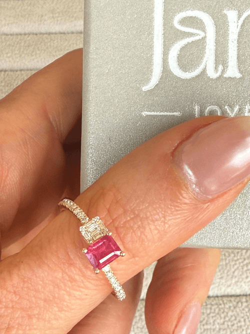 Elegante anillo en oro amarillo 14K protagonizado por un rubí natural en corte esmeralda, montado en cuatro garras que realzan su intensidad y profundidad de color. A su costado, un diamante con cortes baguette enmarcado por un delicado halo de diamantes redondos aporta contraste y sofisticación. La banda, finamente pavé, añade un destello continuo que eleva la pieza a un diseño moderno y atemporal, ideal para quienes buscan una joya única con carácter y equilibrio perfecto entre color y brillo.