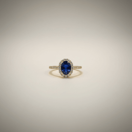 Anillo de alta joyería elaborado en oro amarillo 14K, protagonizado por un cautivador zafiro azul intenso en corte oval, sujeto por delicadas garras que realzan su profundidad y brillo natural. Está enmarcado por un halo de diamantes corte brillante que aporta luminosidad y contraste, mientras que la banda, finamente pavé, añade un destello continuo de elegancia. Su galería elevada tipo canasta permite el paso de la luz, potenciando la belleza de la piedra central. Una pieza clásica y sofisticada, ideal para quienes buscan un diseño atemporal con presencia y distinción.