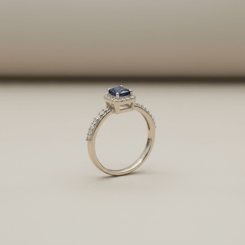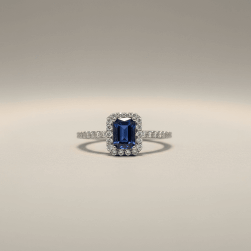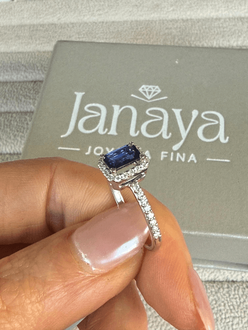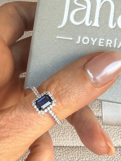 Un zafiro azul profundo en corte esmeralda protagoniza este anillo, enmarcado por un halo de diamantes que potencia su luz y elegancia. Su brazo con diamantes pavé aporta un brillo continuo, creando una pieza sofisticada, moderna y absolutamente irresistible.
