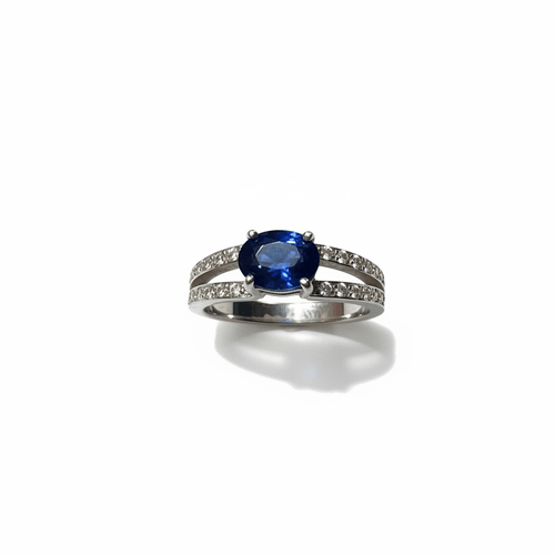 Este anillo combina la elegancia clásica del zafiro azul corte oval con un diseño moderno que realza su intensidad. La banda doble, pavimentada con diamantes corte brillante, crea un marco luminoso que abraza la gema central llevándola al máximo protagonismo.