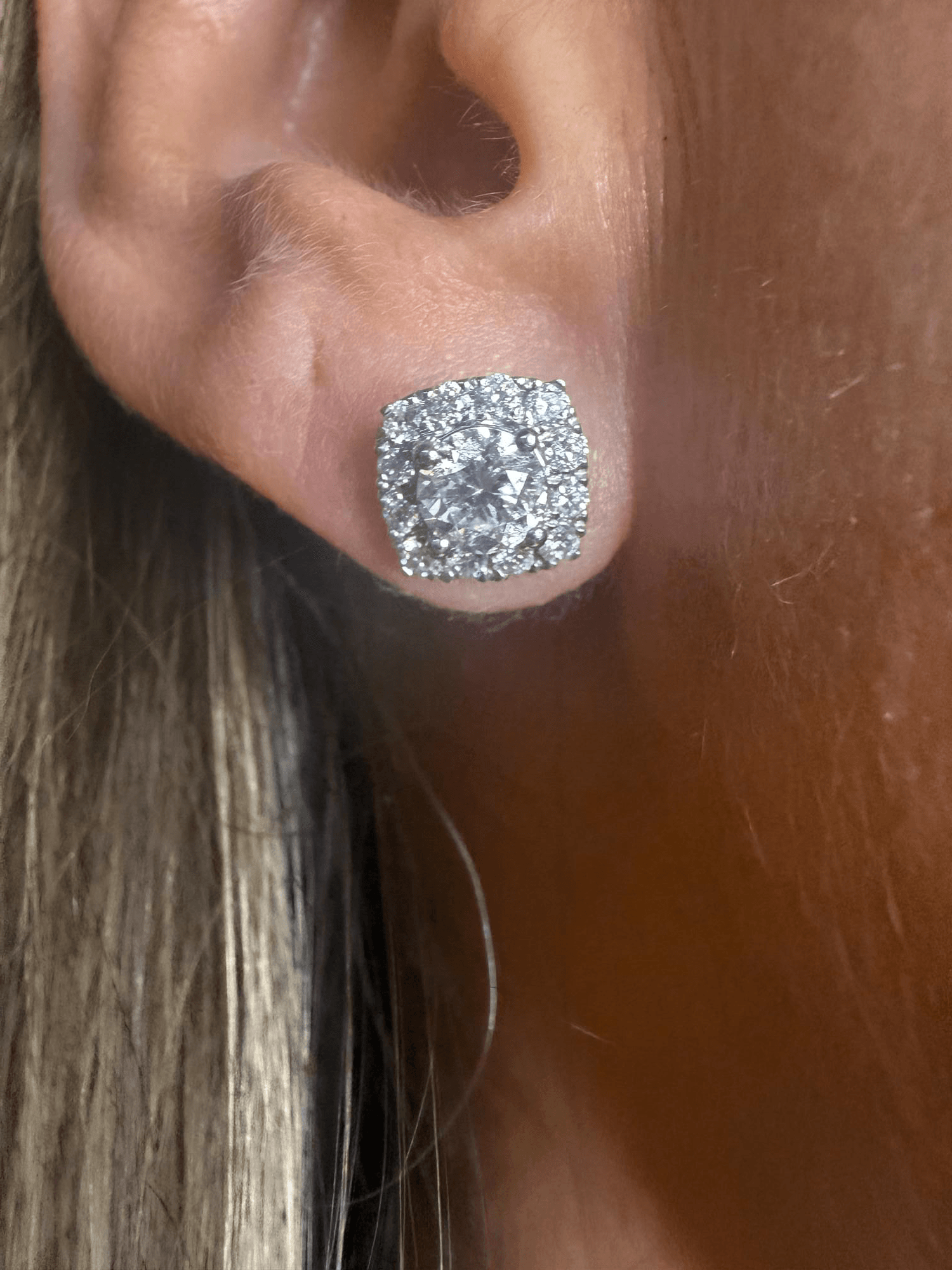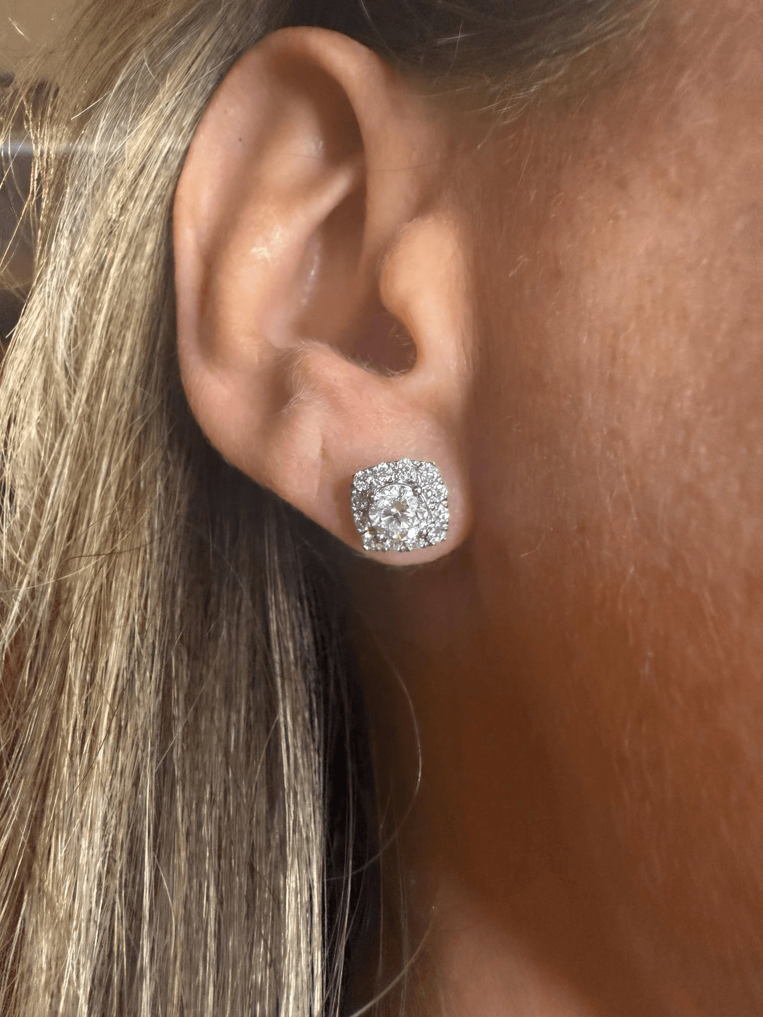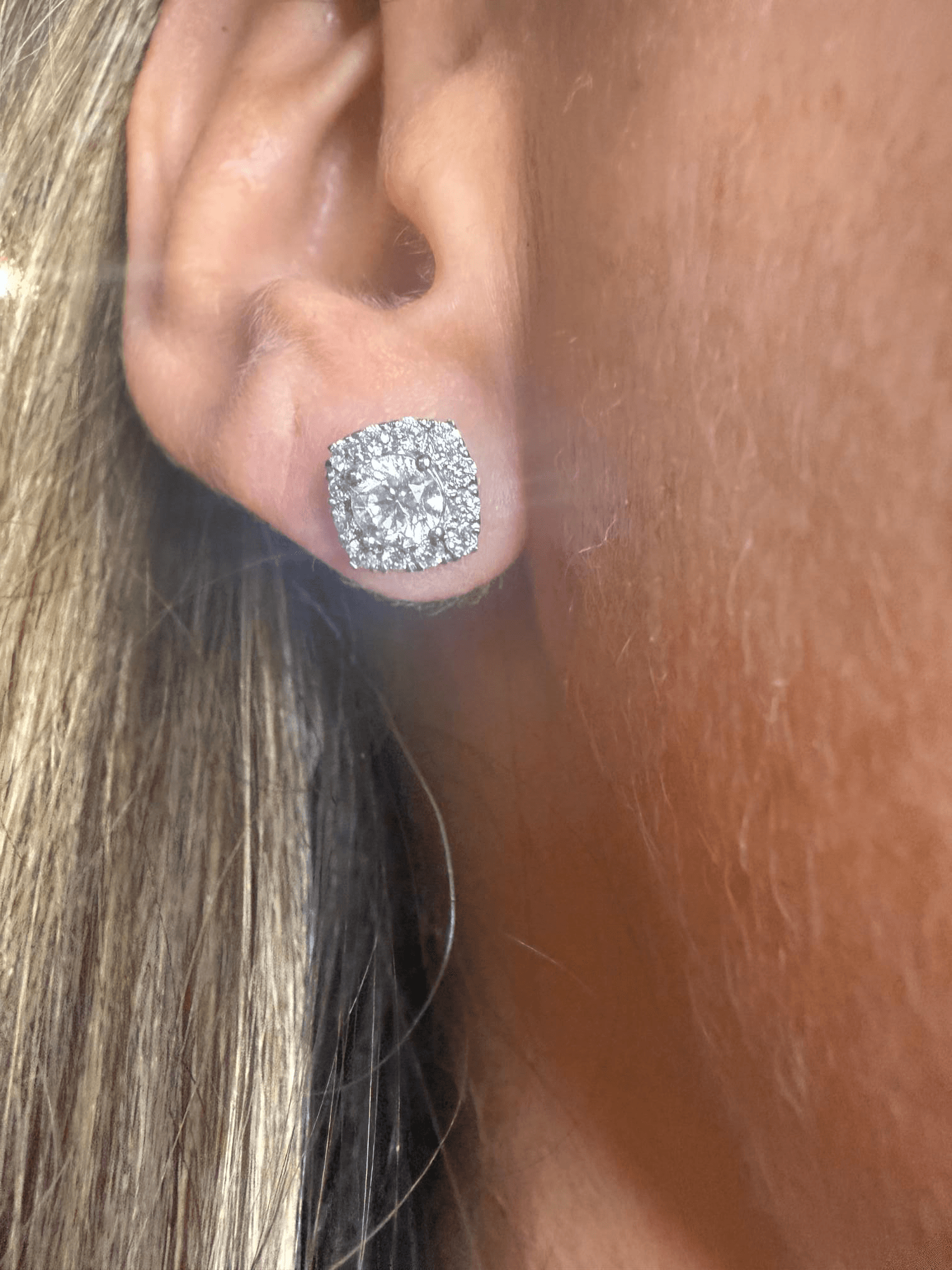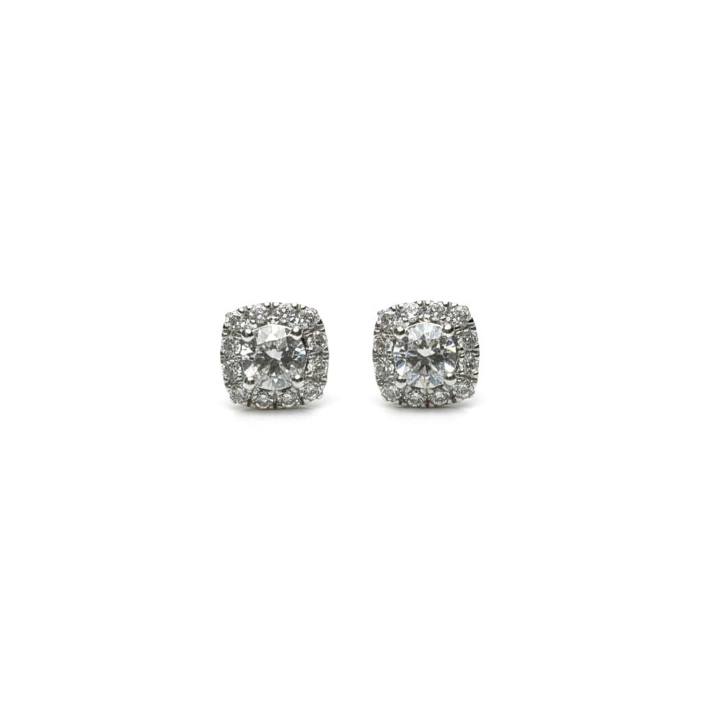 Aretes tipo stud en oro blanco con un diseño halo cuadrado que enmarca una piedra central de corte brillante redondo. El diamante principal resalta por su intenso destello, rodeado por una hilera de pequeños diamantes que potencian su brillo y crean un efecto de elegancia clásica y sofisticada. Perfectos para llevar de día o de noche, aportando un toque atemporal de lujo.