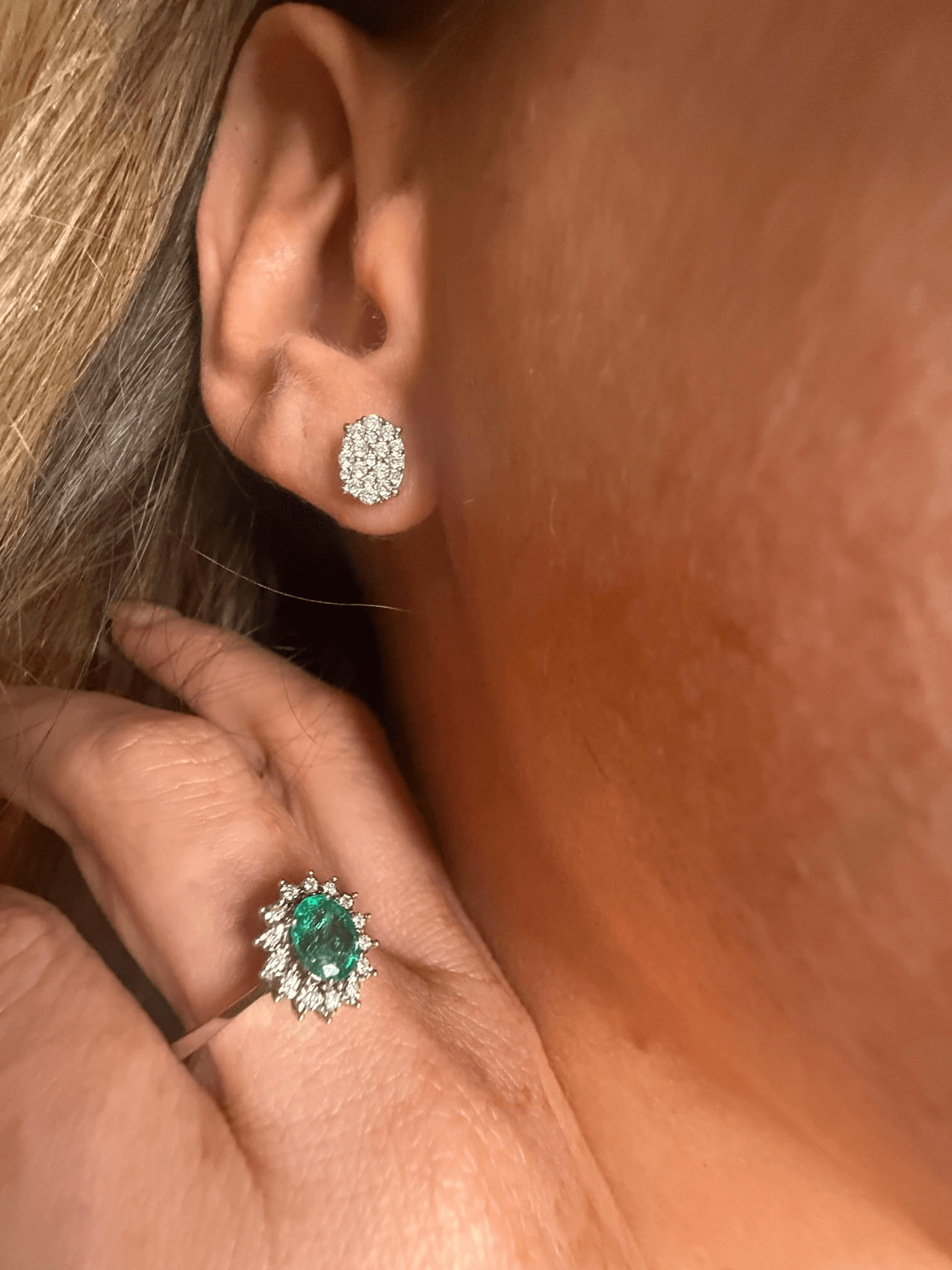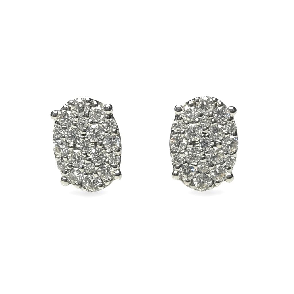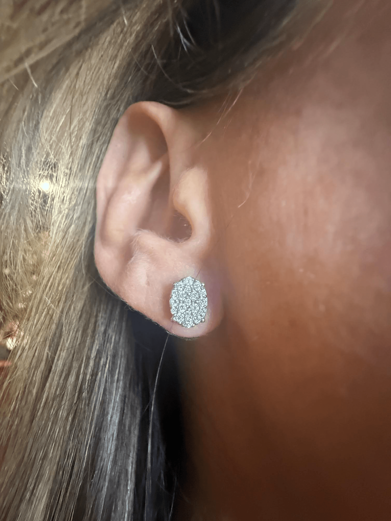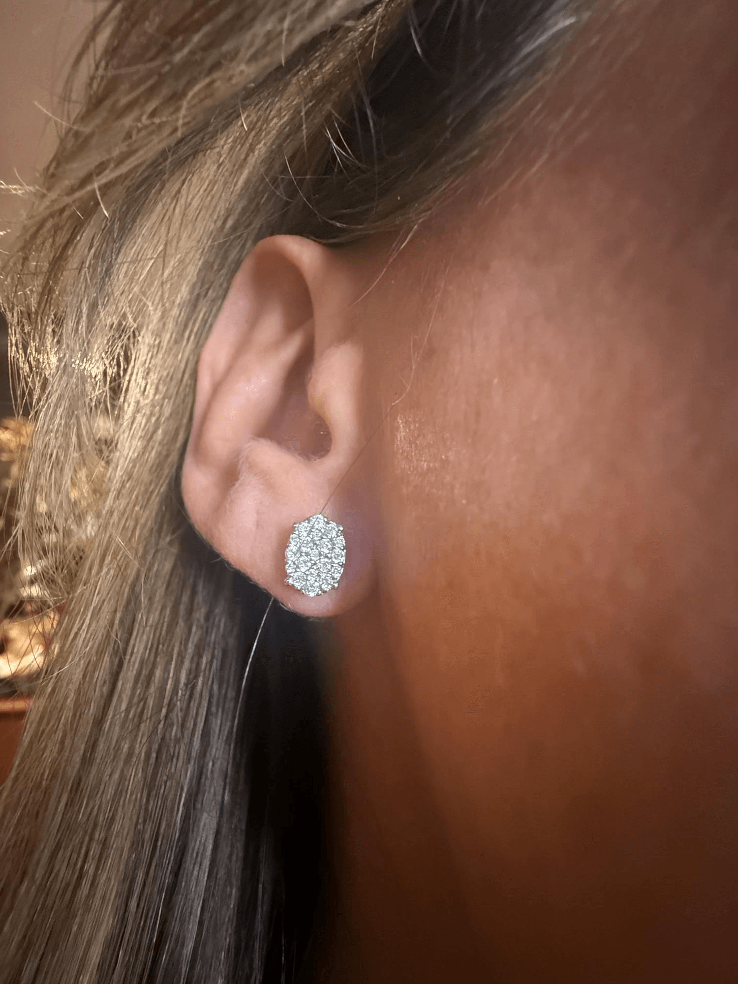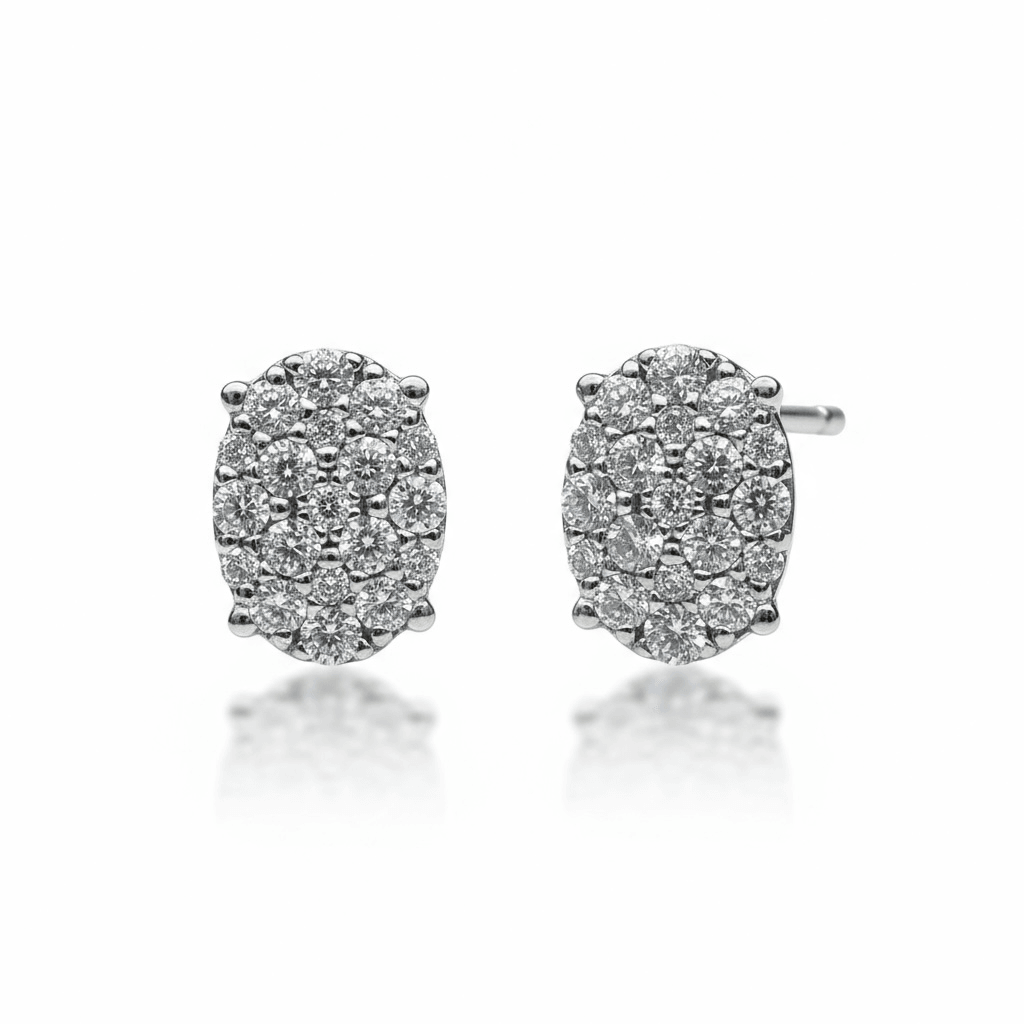 Elegantes aretes tipo stud en forma ovalada, confeccionados en oro blanco con un fino engaste de múltiples diamantes redondos en corte brillante, dispuestos en un diseño tipo cluster pavé que maximiza el destello y la profundidad del brillo. Su forma ovalada y perfil bajo los hace ideales para uso diario con un toque de lujo refinado.