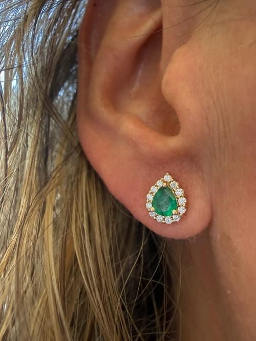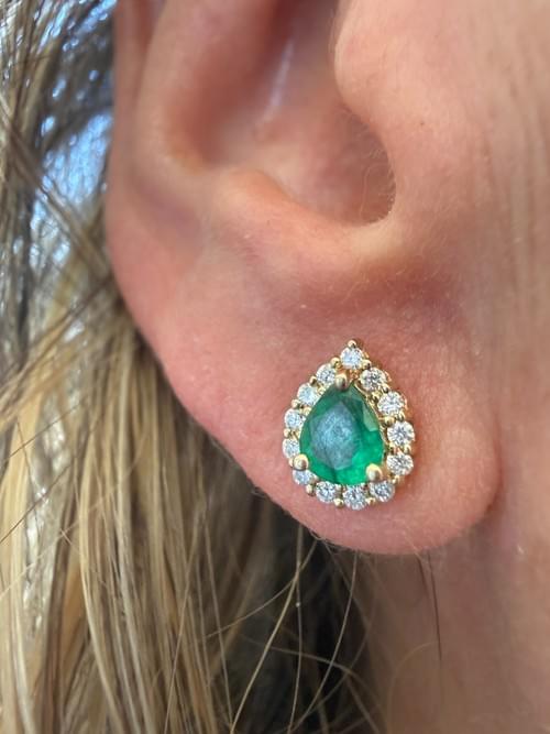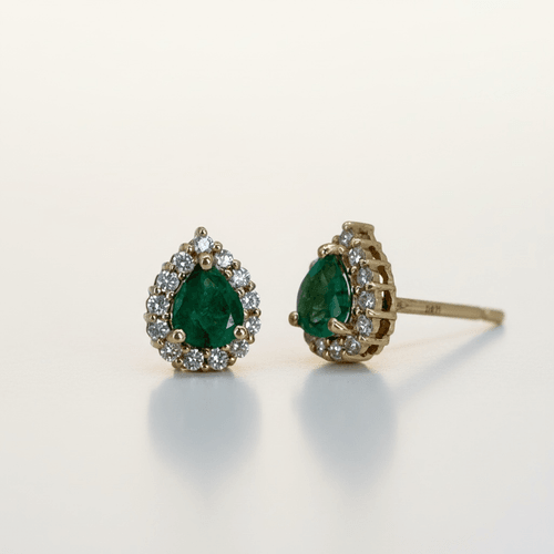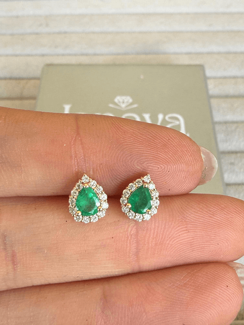Aretes en oro amarillo 14K con esmeraldas naturales en elegante corte pera, rodeadas por un delicado halo de diamantes que realza su color verde intenso. Su diseño clásico tipo stud aporta brillo, sofisticación y versatilidad, perfectos para uso diario o para elevar cualquier look con un toque de alta joyería.