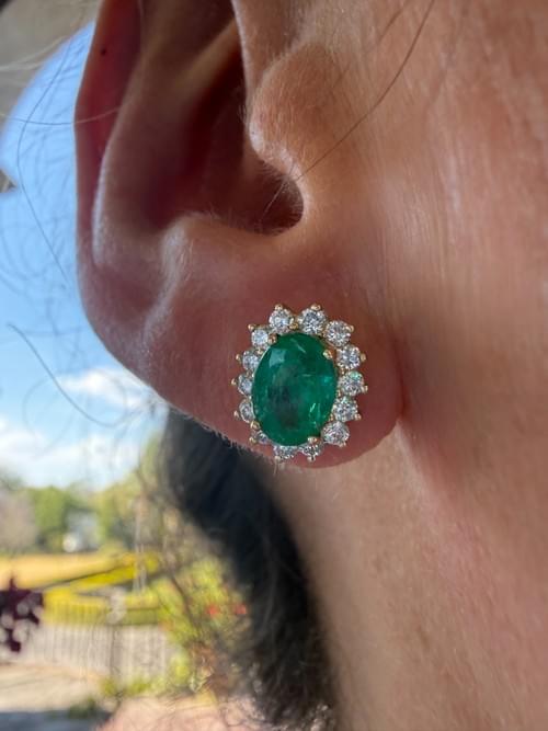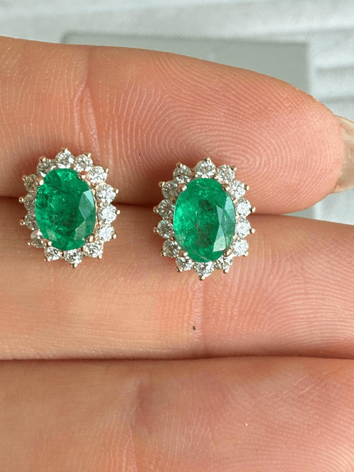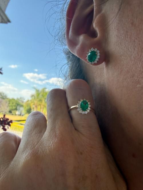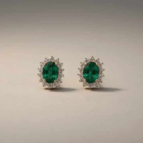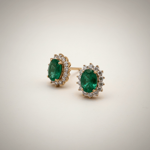 Aretes de elegancia atemporal con esmeraldas naturales en corte oval como protagonistas, rodeadas por un delicado halo de diamantes corte brillante que realza su color verde profundo. Montados en oro amarillo, su diseño clásico con garras finas aporta luz, sofisticación y un brillo excepcional en cada ángulo. Una pieza icónica de alta joyería, perfecta para elevar cualquier ocasión.
