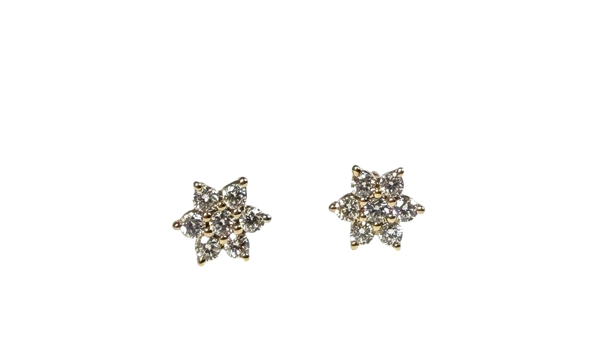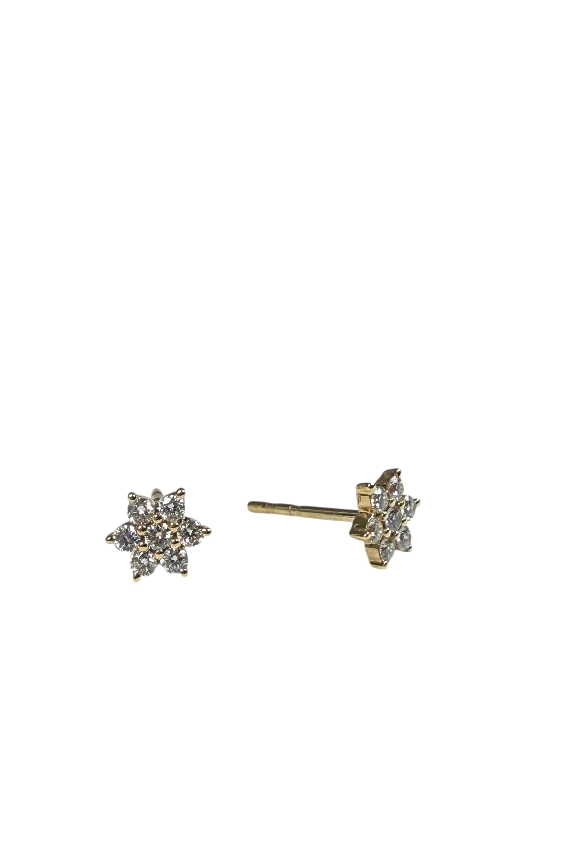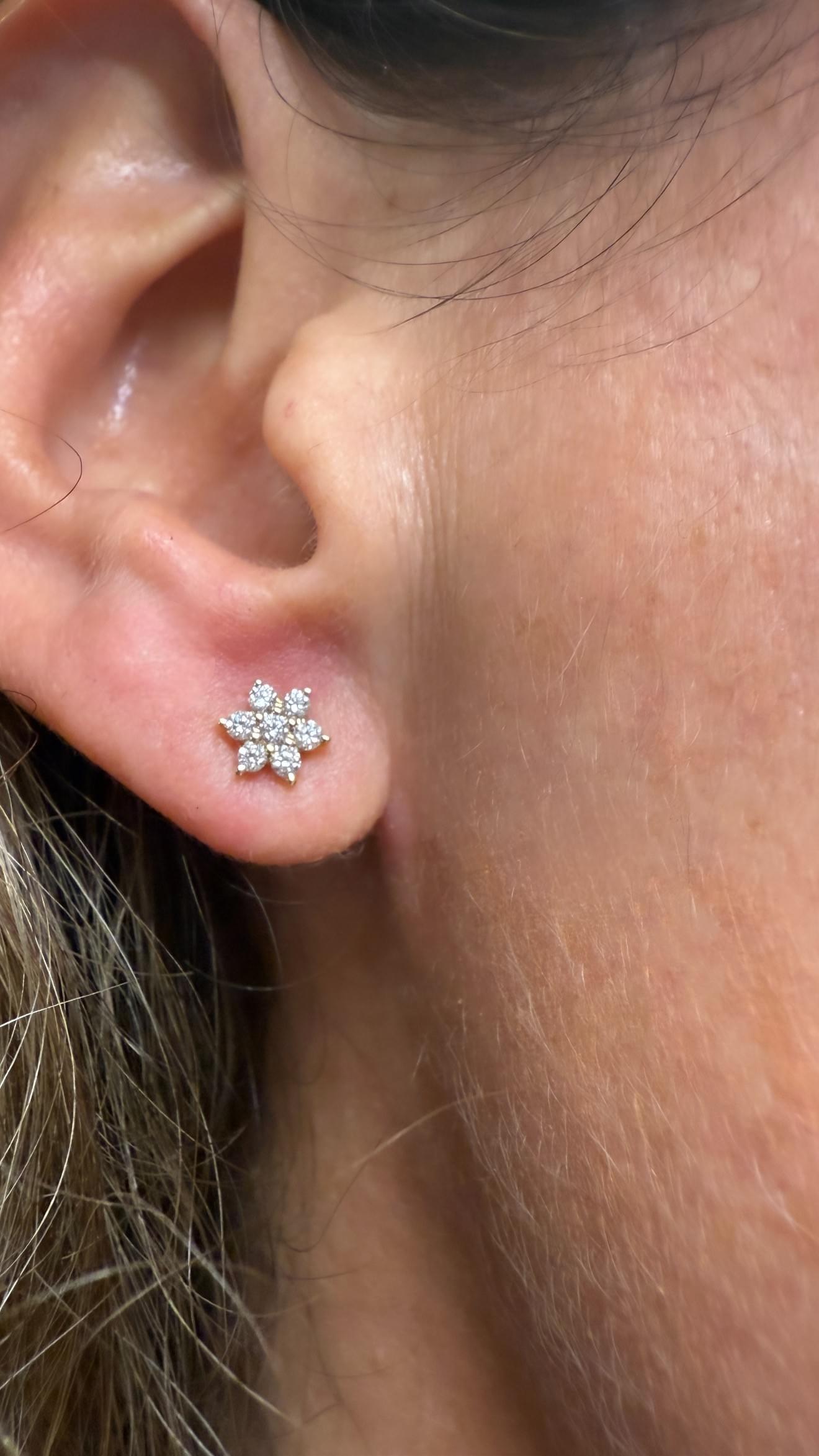 Encantadores aretes tipo botón en forma de flor, elaborados en oro amarillo con brillantes diamantes redondos en corte brillante. Cada pétalo está compuesto por diamantes montados en un delicado engaste de garras que realza su brillo y simula una estrella o copo de nieve. Su diseño atemporal y luminoso los convierte en una pieza perfecta para el uso diario o para aportar un toque de elegancia a cualquier ocasión.