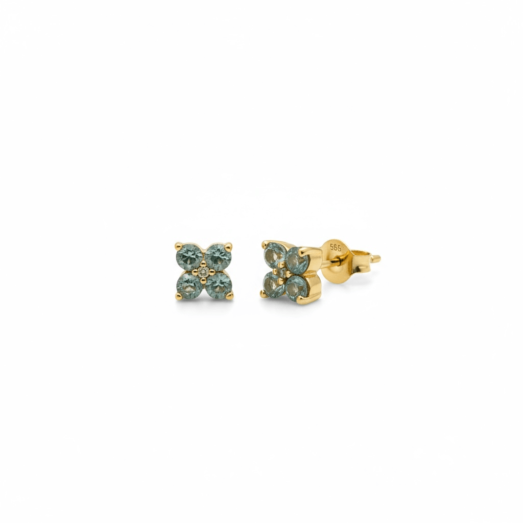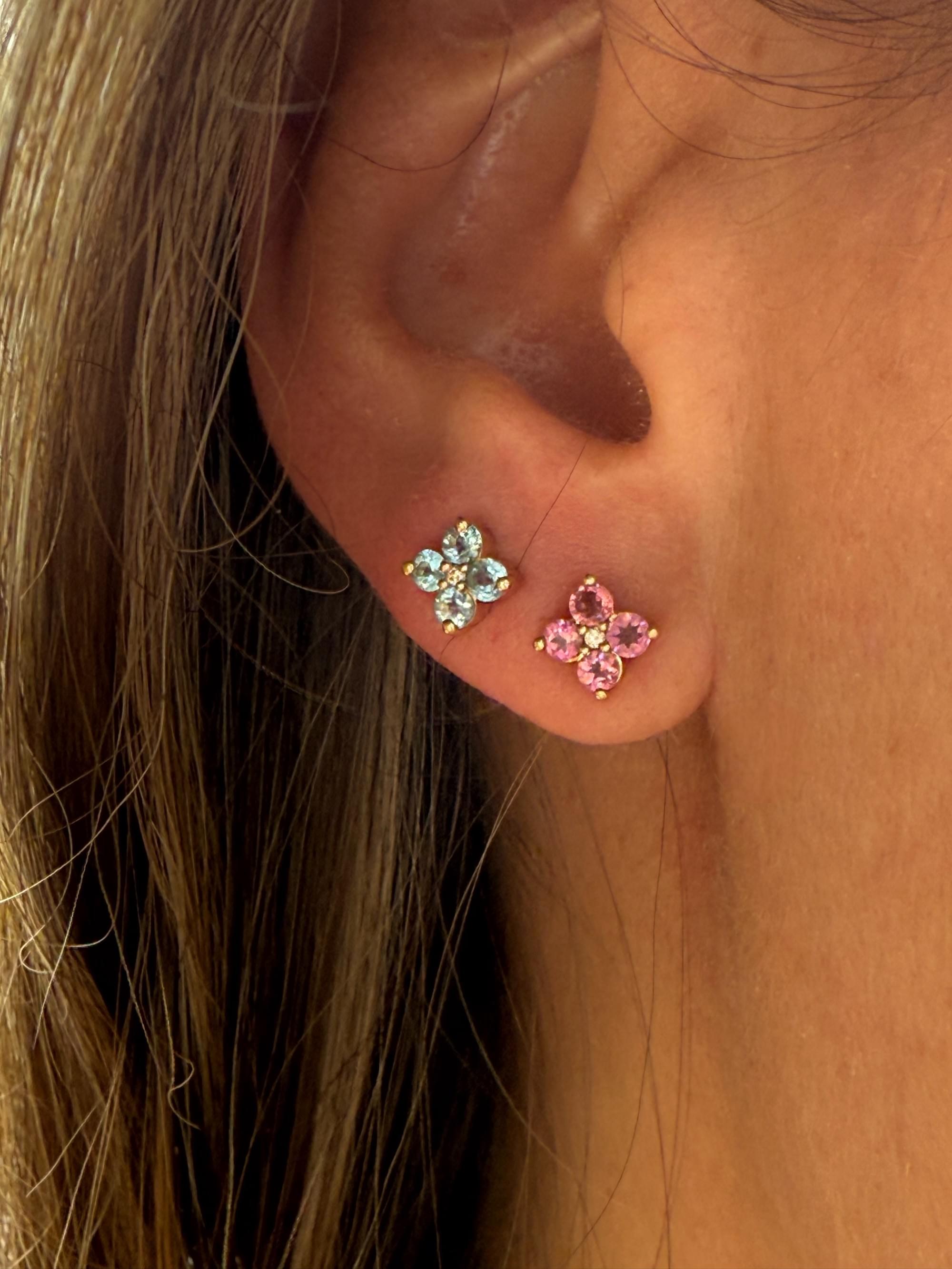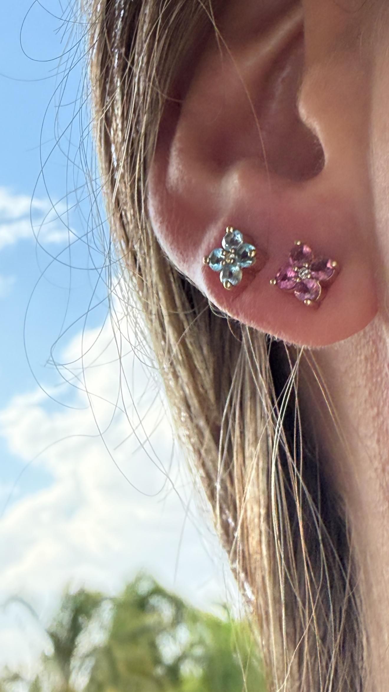 Delicados aretes en forma de flor, elaborados en oro amarillo con cuatro topacios azules redondos y un diamante central, dispuestos en un diseño simétrico que resalta su brillo y frescura. Un toque elegante y femenino para cualquier ocasión.