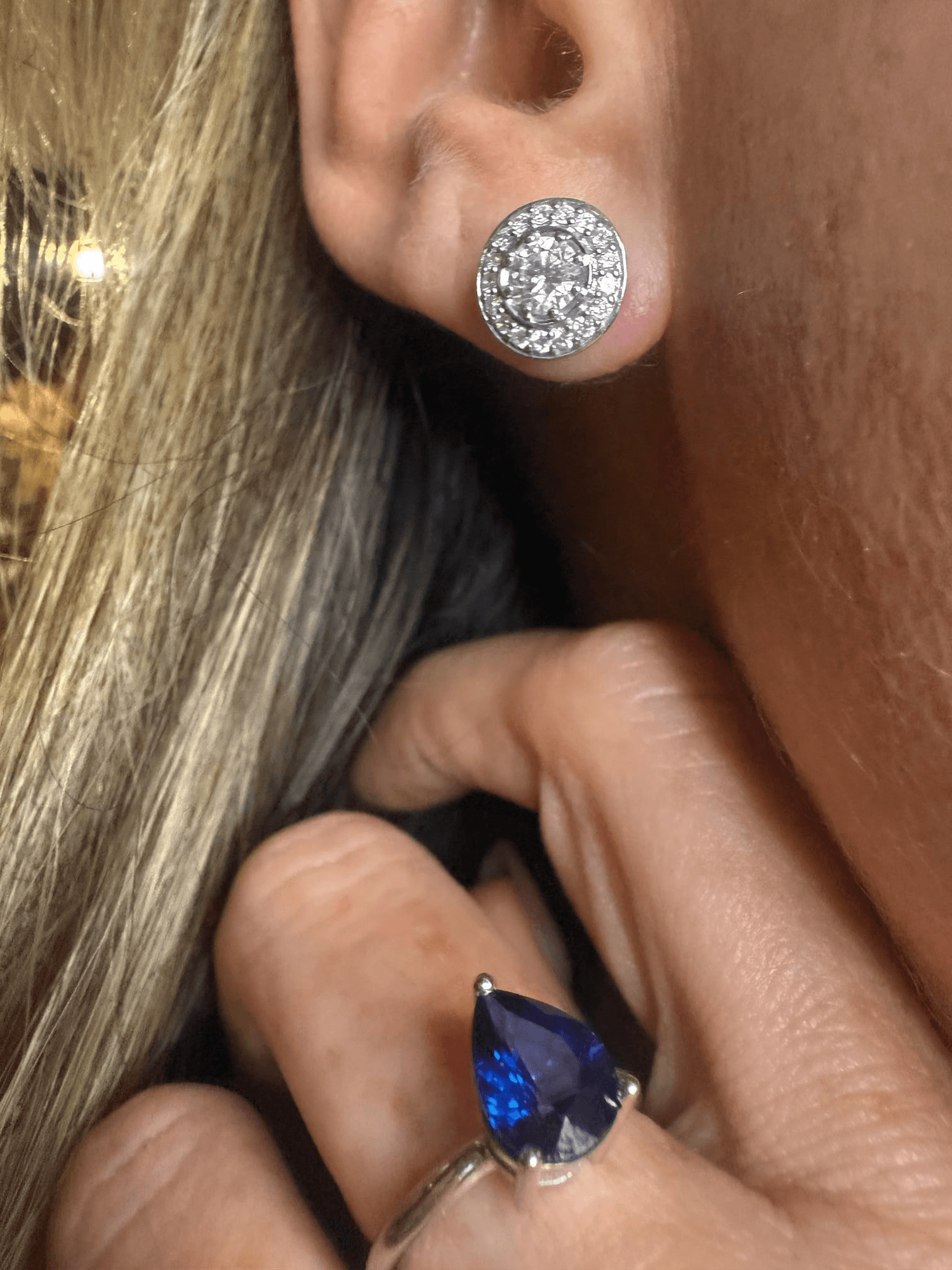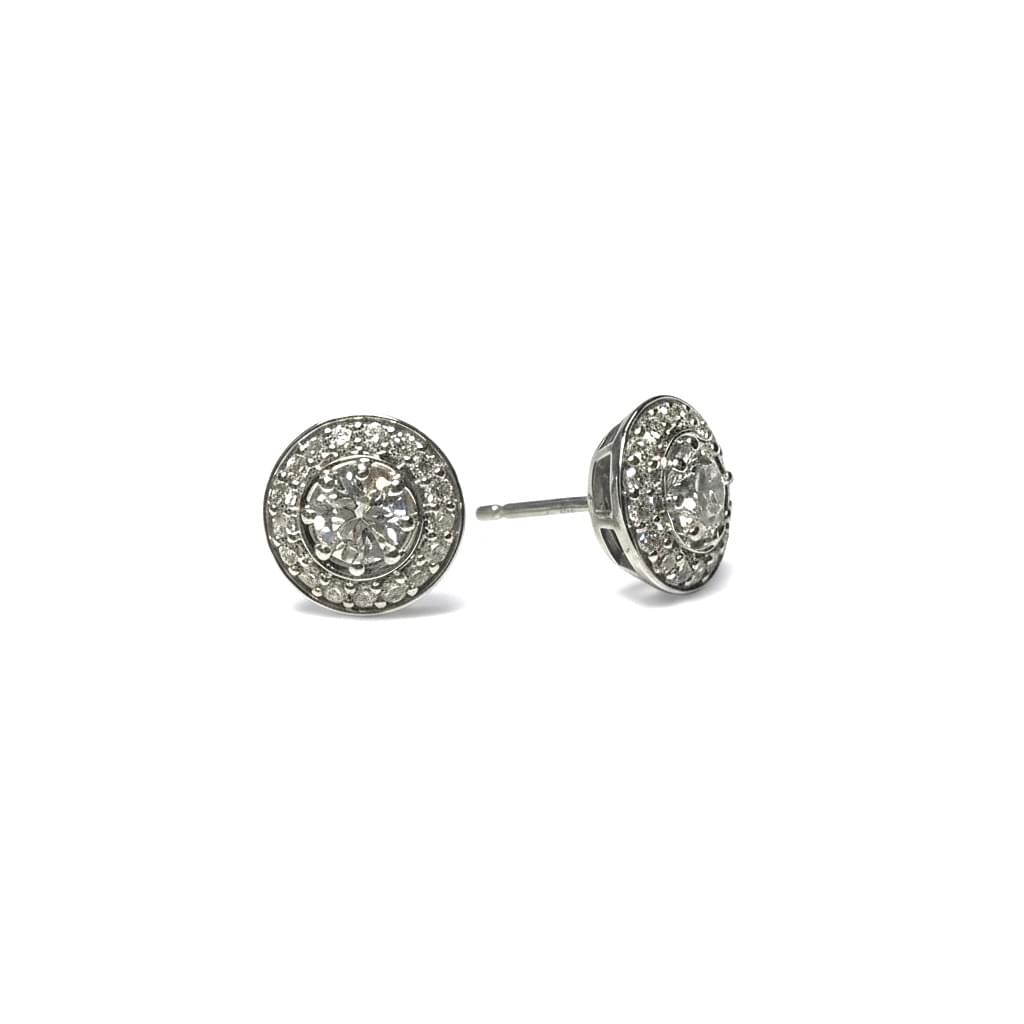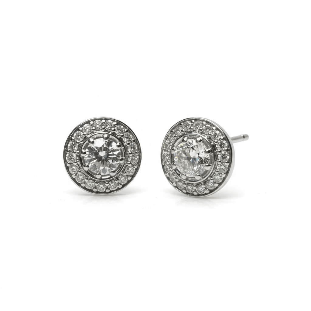 Elegantes aretes tipo stud elaborados en oro blanco, con un diseño atemporal que combina sofisticación y brillo. Cada pieza presenta un diamante central de corte brillante redondo, enmarcado por un halo de diamantes pavé que realzan su fulgor y aportan profundidad al diseño. Perfectos para uso diario o para añadir un toque de lujo discreto en ocasiones especiales.