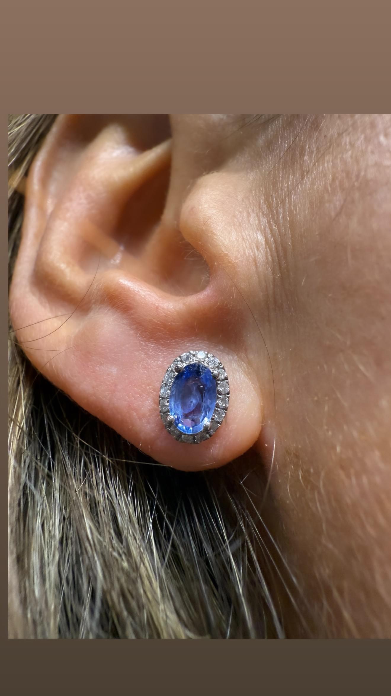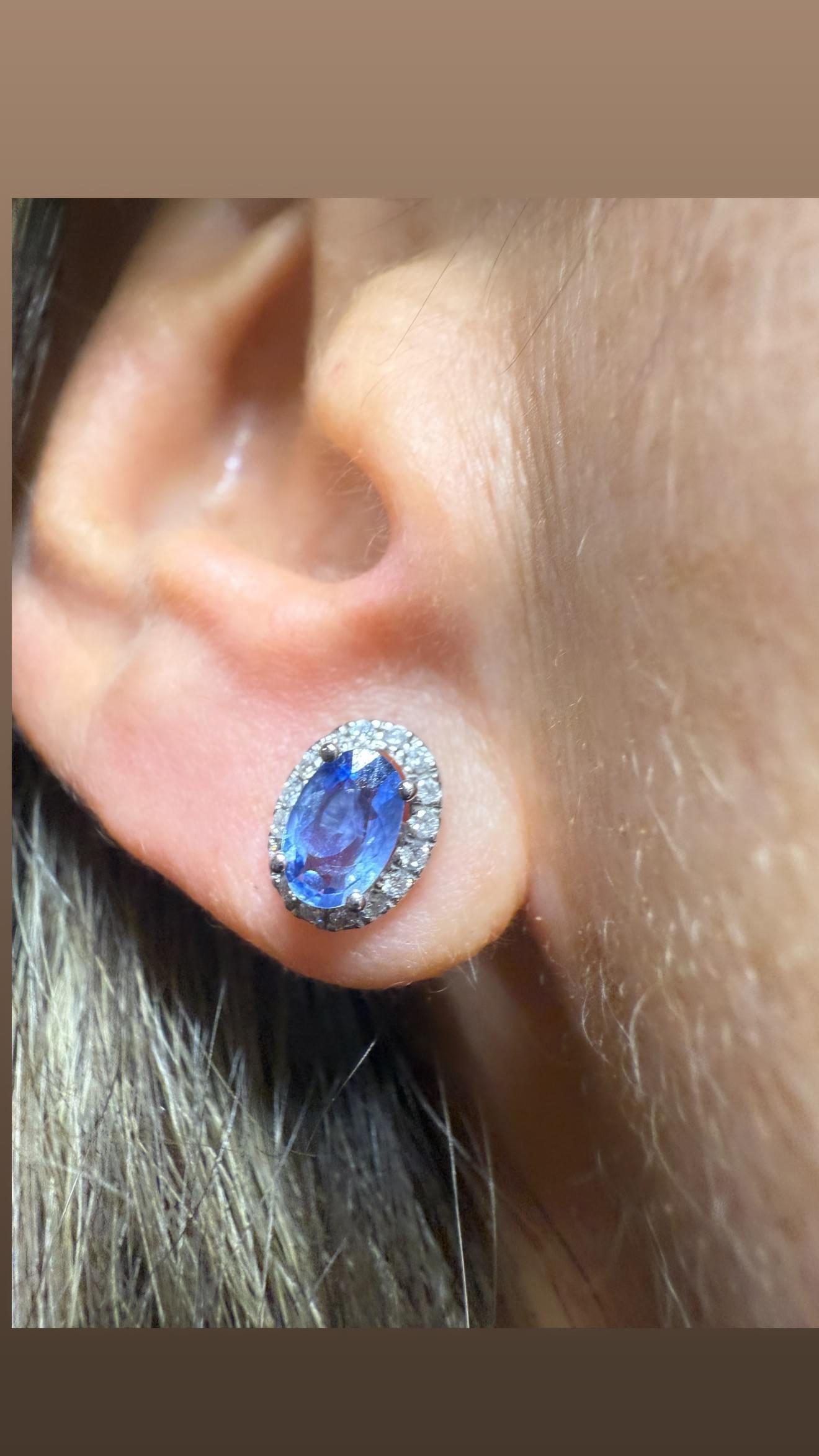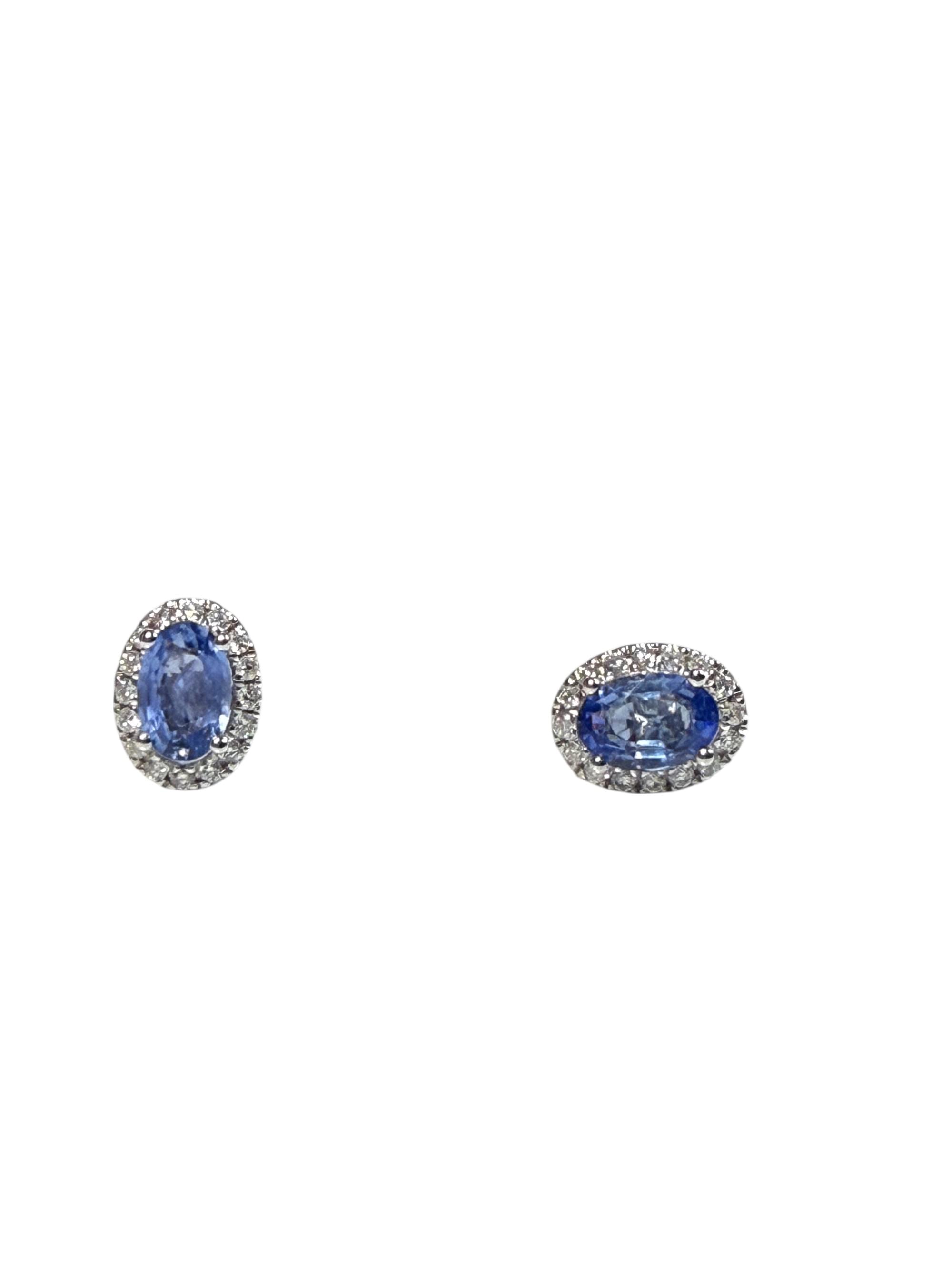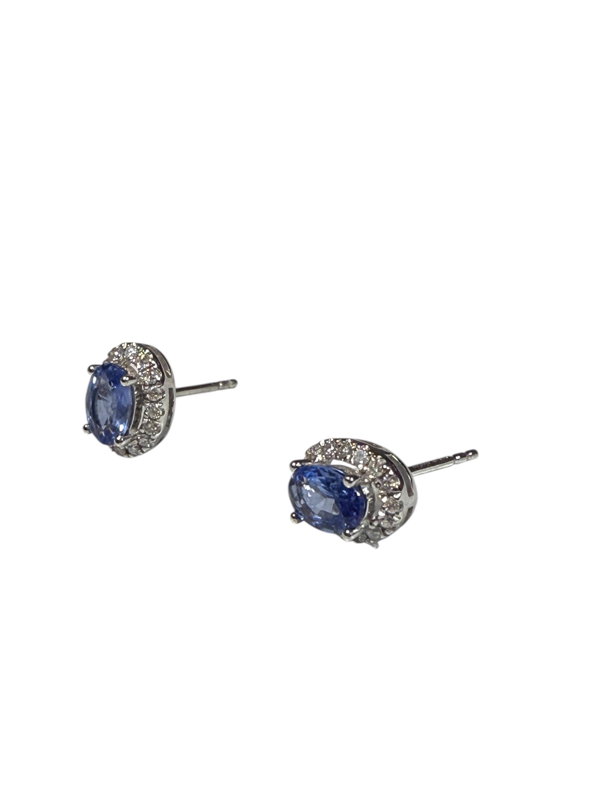 Elegantes aretes tipo botón protagonizados por zafiros naturales en tono azul, tallados en forma ovalada y engarzados con cuatro finas garras. Cada piedra central está enmarcada por un delicado halo de diamantes blancos en pavé, creando un contraste luminoso que realza la profundidad del zafiro. Elaborados en oro blanco de 18K, estos aretes combinan sofisticación clásica con un brillo atemporal, perfectos tanto para eventos formales como para elevar un look de día con un toque de distinción.