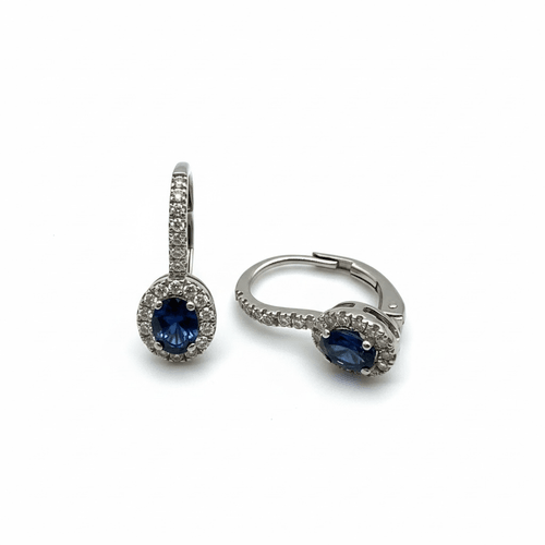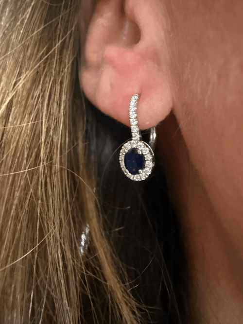 Elegantes arracadas tipo huggie elaboradas en oro blanco 14K, protagonizadas por un intenso zafiro azul corte oval brillante, asegurado con delicadas garras de alta precisión.