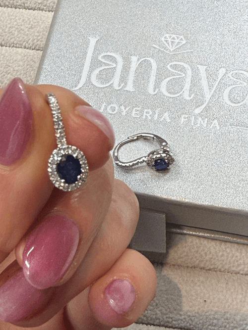 Cada gema central está rodeada por un halo de diamantes naturales corte brillante redondo que realzan su profundidad y luminosidad. La arracada presenta una línea de micro pavé de diamantes que aporta destello continuo desde el lóbulo hasta el centro de la pieza.