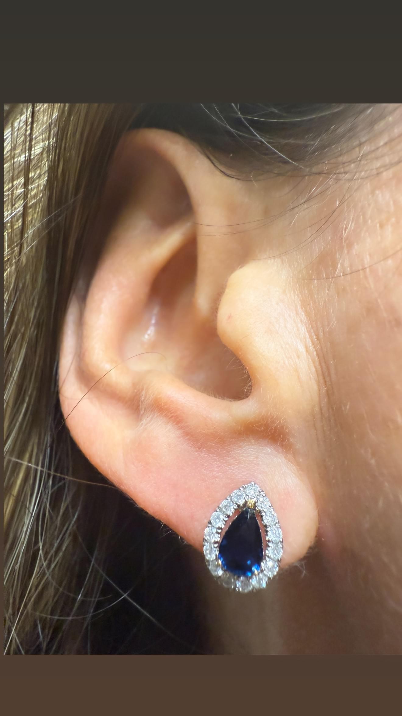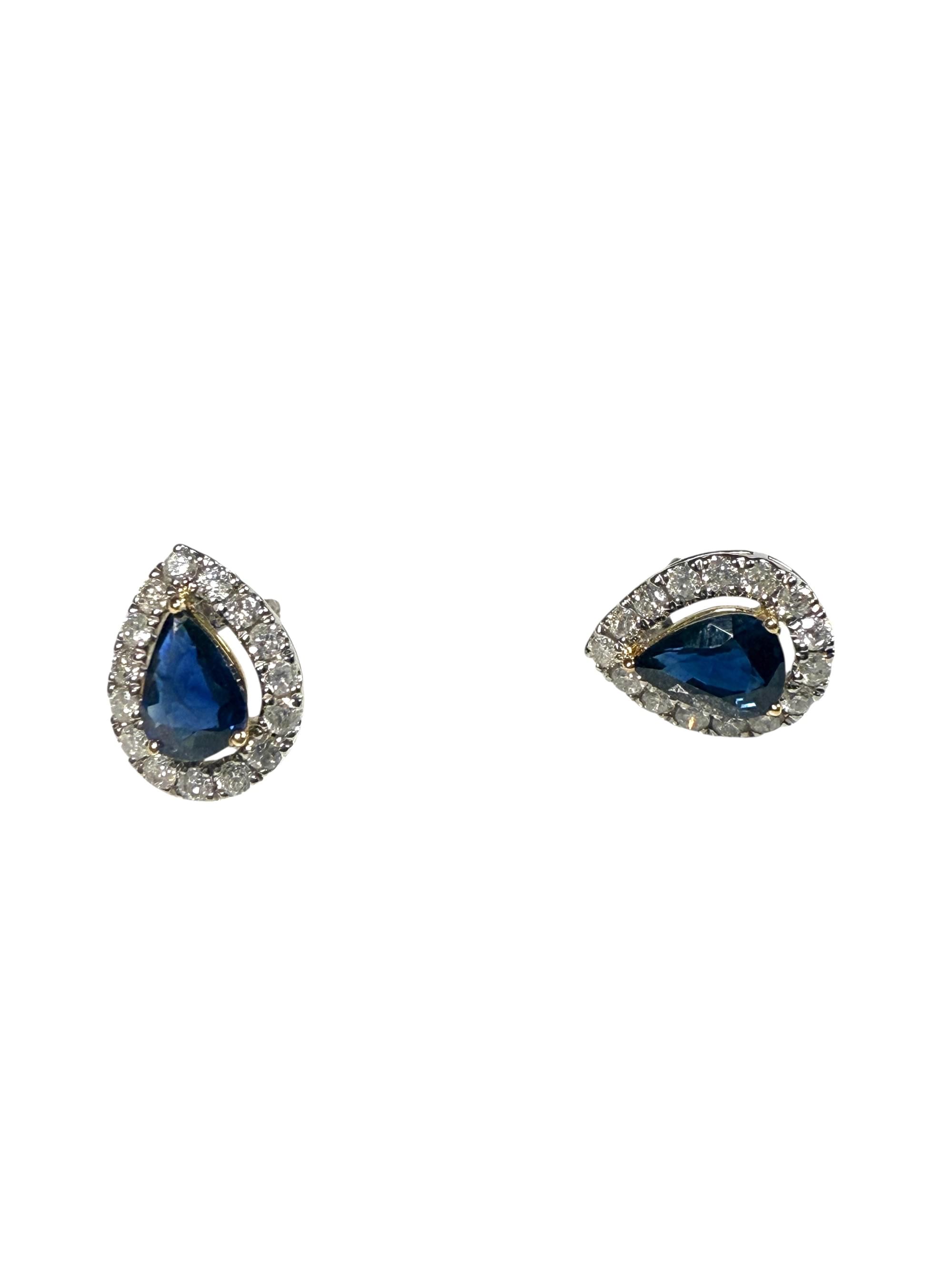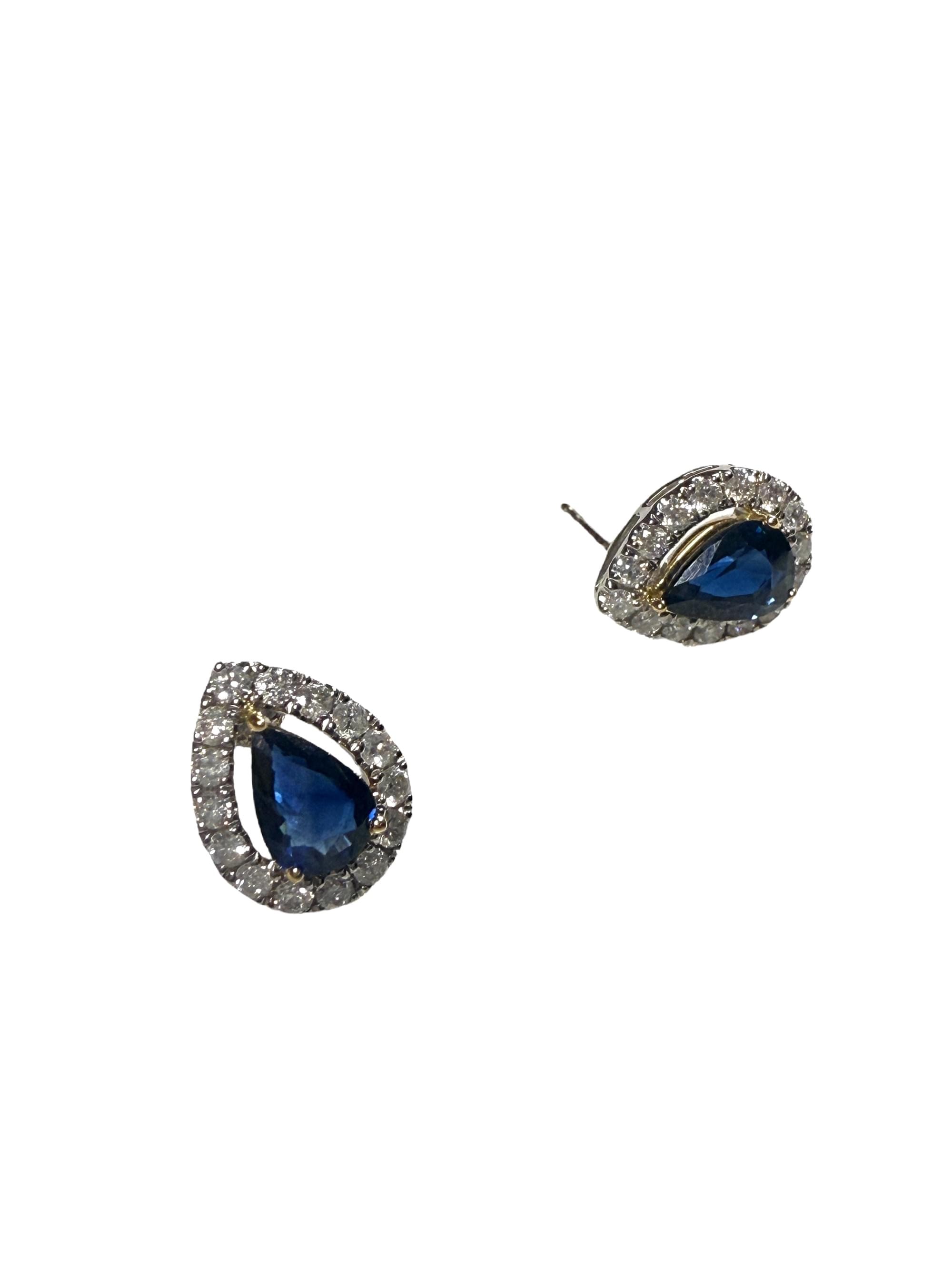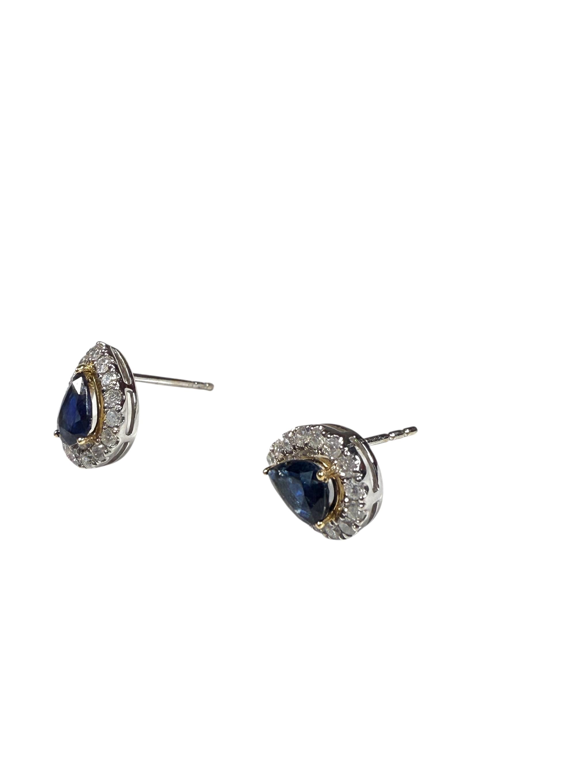 Elegantes aretes tipo botón en oro blanco de 14 K, con un diseño clásico en forma de lágrima. En el centro, un zafiro azul corte pera brilla con intensidad, sostenido por delicadas garras en oro amarillo que aportan un contraste cálido y sofisticado. El borde está realzado por un halo de diamantes redondos en pavé que intensifica el destello y resalta la profundidad del zafiro.