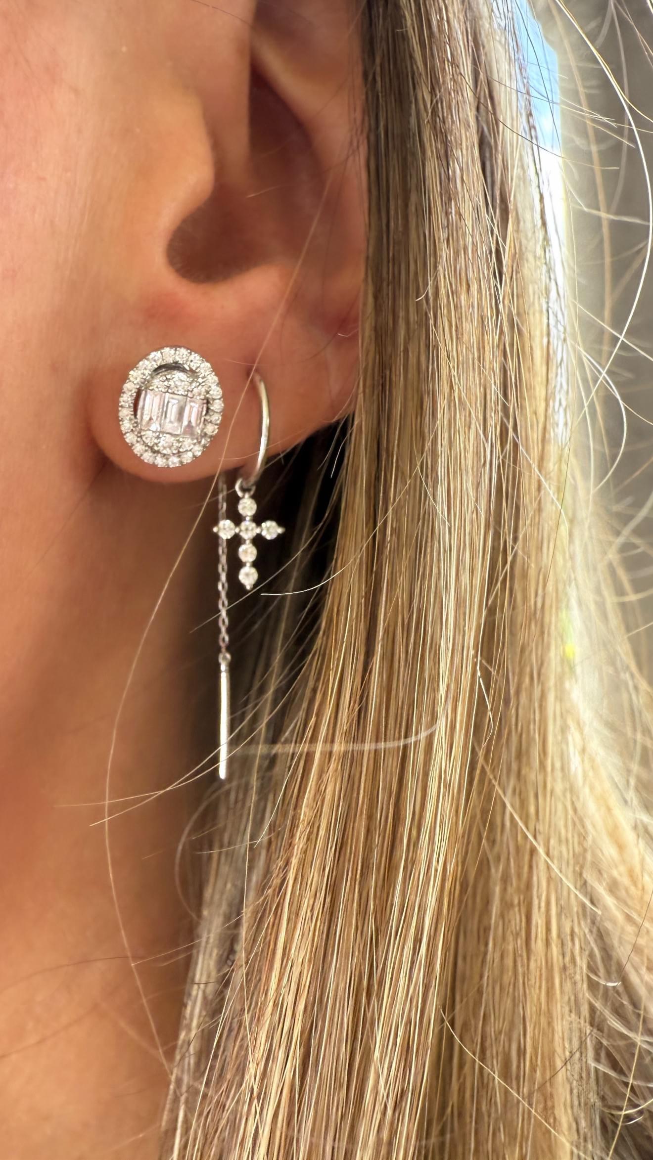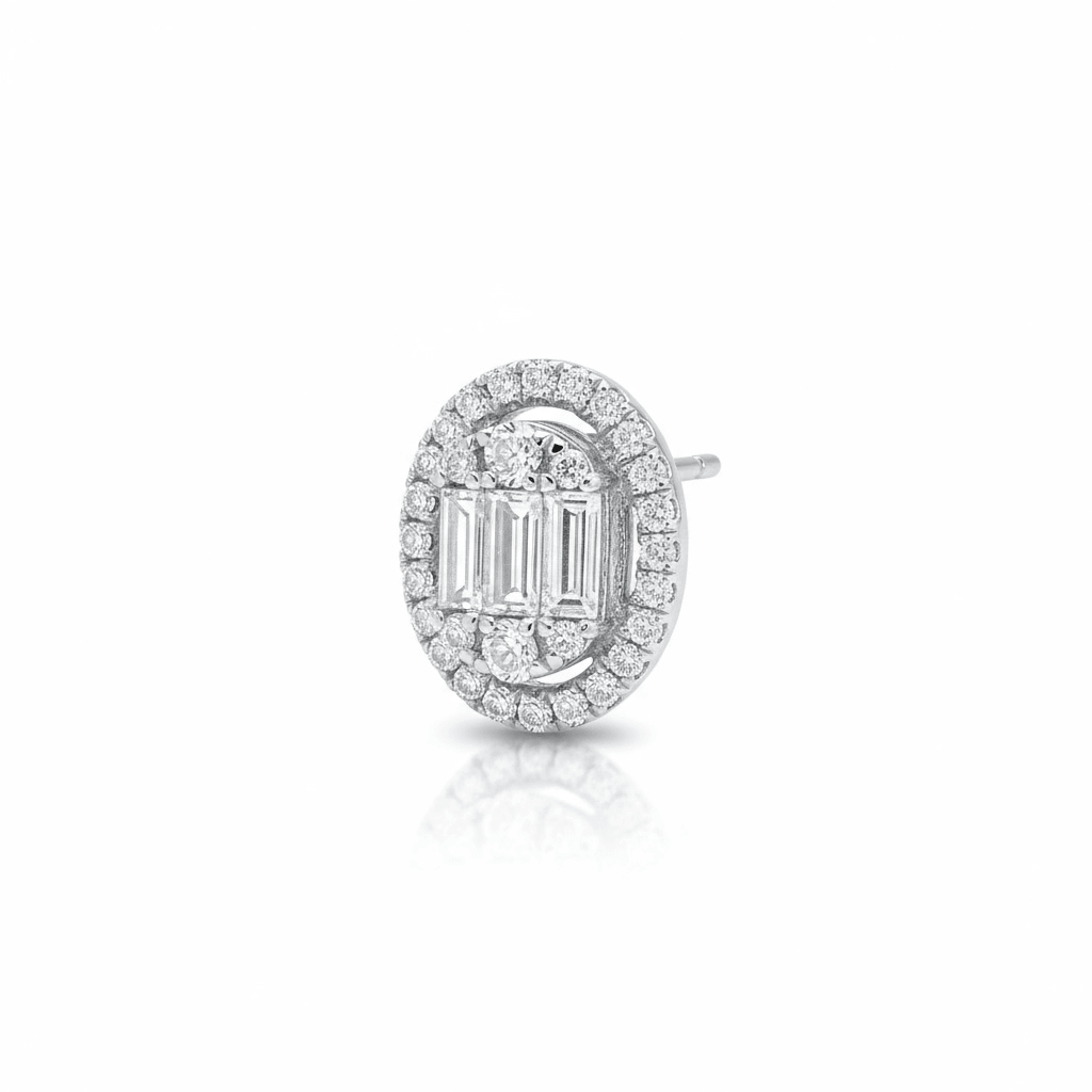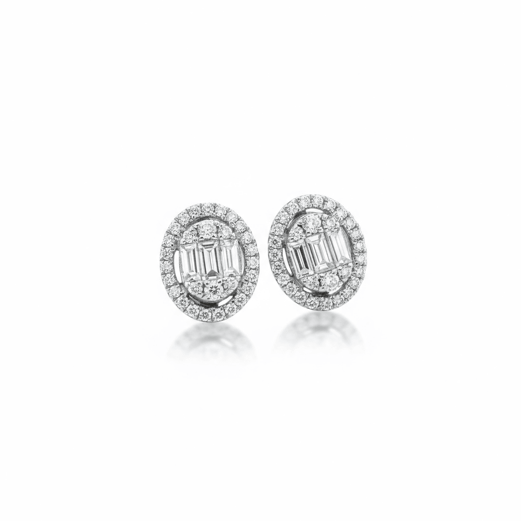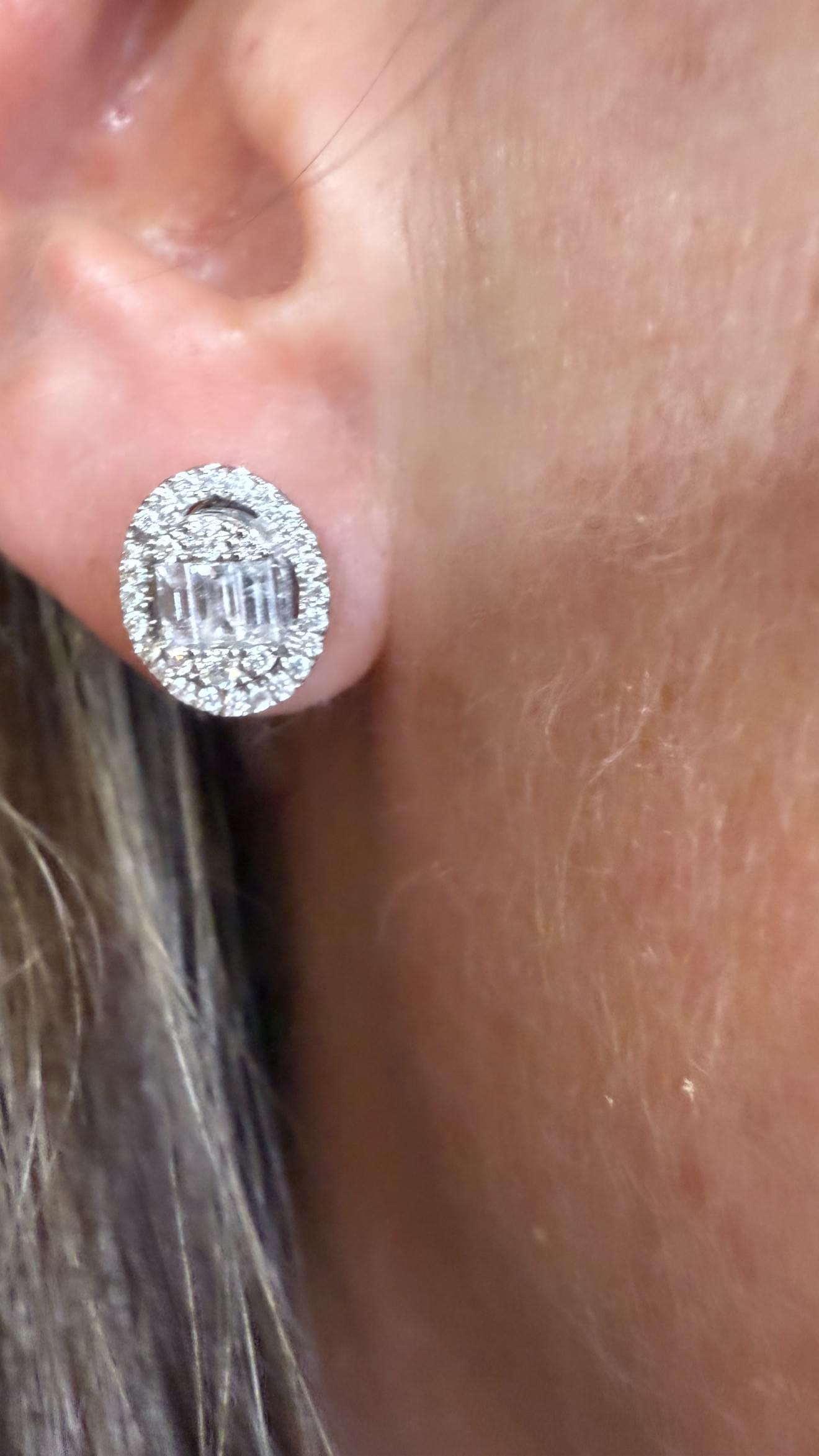 Elegantes aretes de forma ovalada en oro blanco, con un centro formado por diamantes corte baguette alineados horizontalmente, enmarcados por un doble halo de diamantes corte brillante que realza su resplandor y aporta un toque sofisticado.