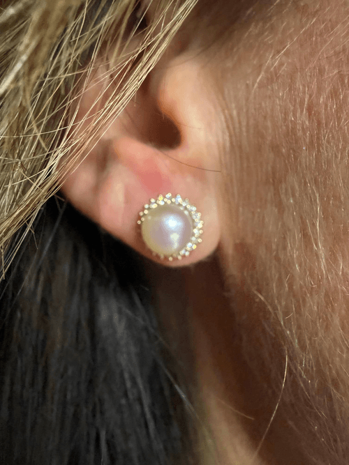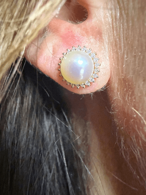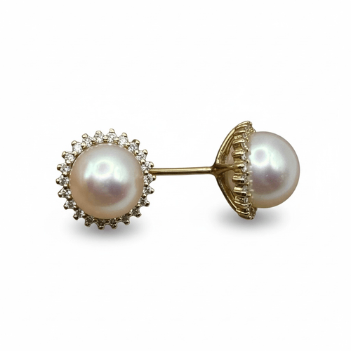 Aretes tipo stud elaborados en oro amarillo 14K, protagonizados por una perla redonda de alto brillo y excelente lustre, rodeada por un delicado halo de diamantes naturales corte brillante.