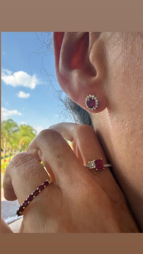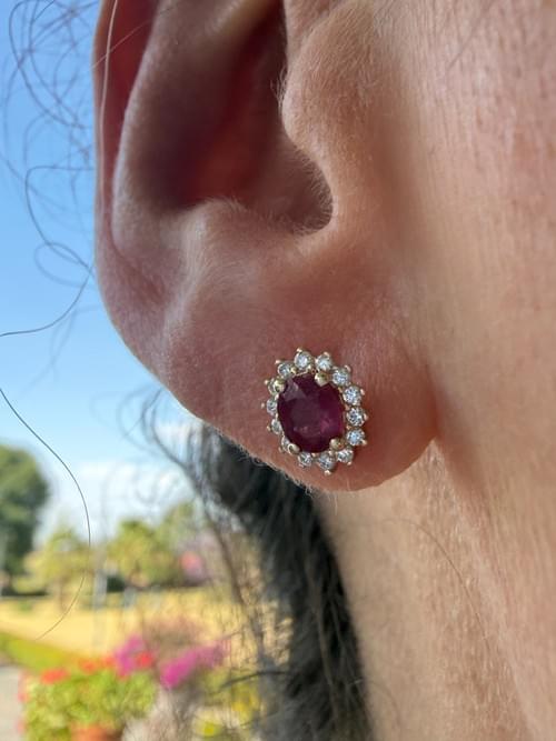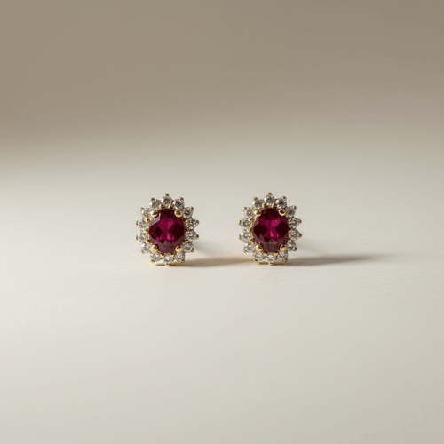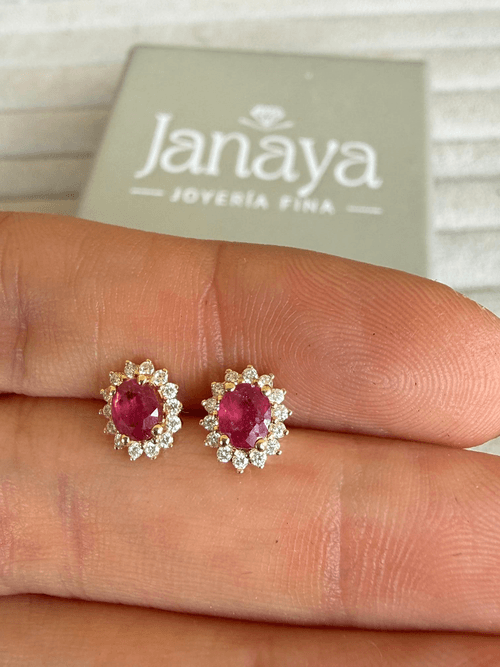Aretes en oro amarillo que destacan un rubí natural en corte oval, rodeado por un delicado halo de diamantes corte brillante que realza su intensidad y luminosidad. Un diseño clásico de alta joyería que equilibra elegancia y sofisticación, perfecto para uso diario o ocasiones especiales. Su tamaño sutil los convierte en una pieza atemporal que ilumina el rostro con un toque de color y brillo refinado.