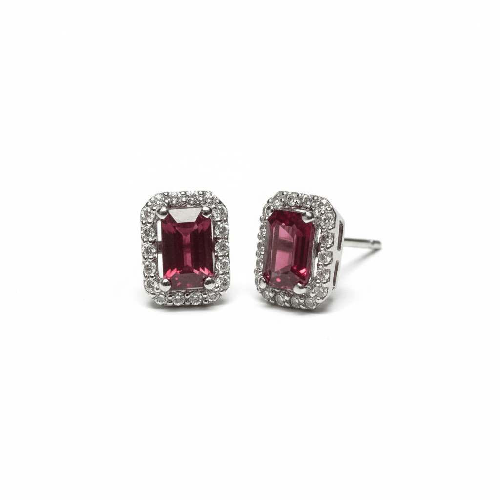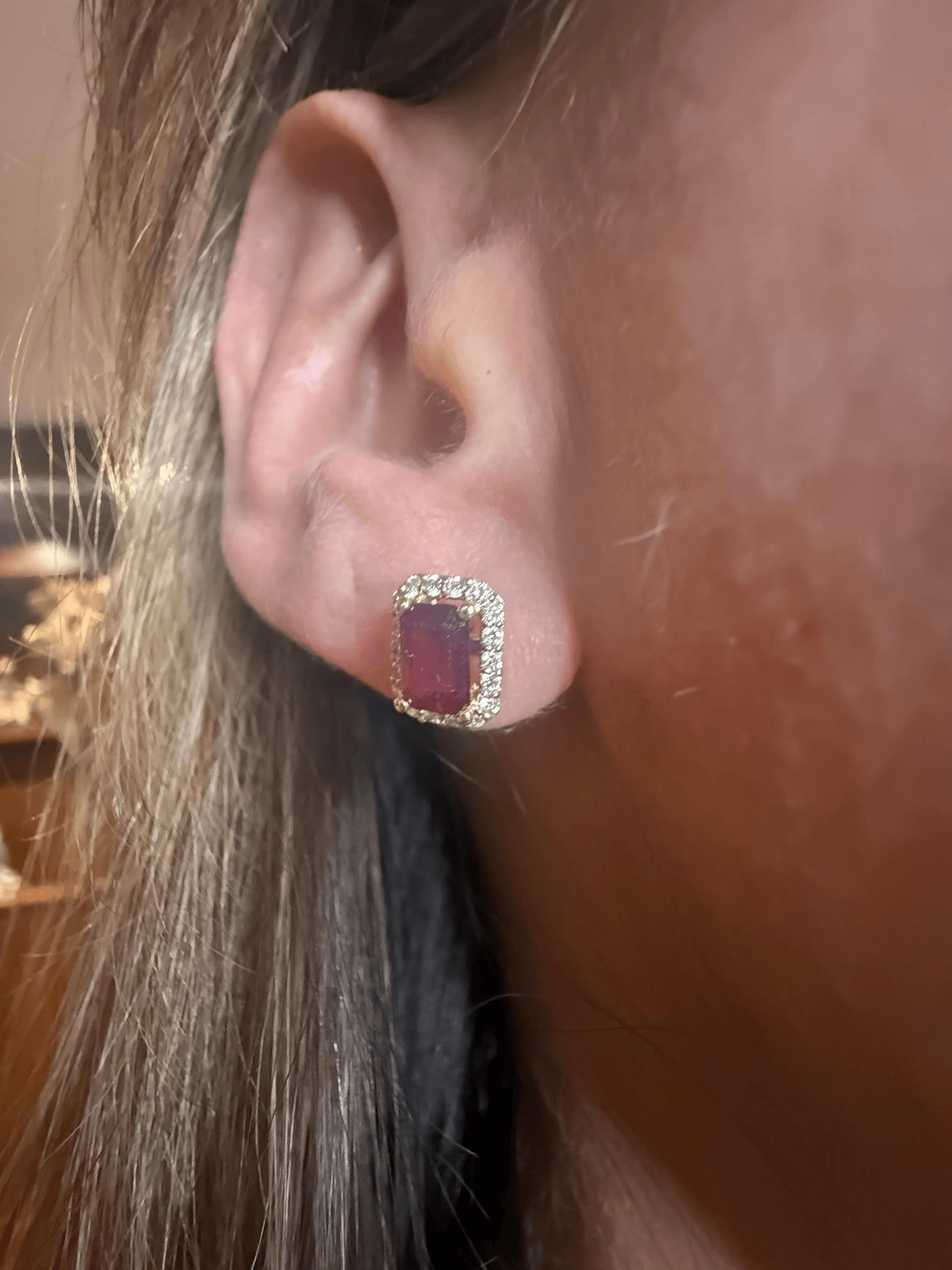 Elegantes aretes tipo stud con rubíes centrales en corte esmeralda, engarzadas en oro blanco y rodeadas por un halo de brillantes diamantes que realzan su luminosidad. Su diseño rectangular con esquinas suavemente facetadas aporta un toque clásico y sofisticado, ideal para uso diario o para complementar un look de noche con distinción.