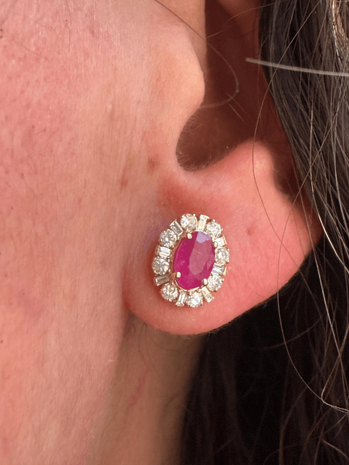 Elegantes aretes de rubí natural en corte ovalado, montados en oro amarillo, rodeados por un sofisticado halo de diamantes naturales. El diseño alterna diamantes corte brillante redondo con diamantes corte baguette, creando un efecto luminoso y arquitectónico que realza la intensidad del rubí central.