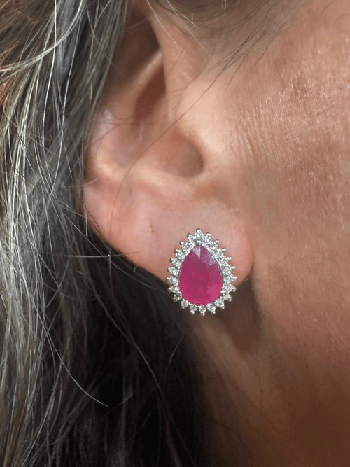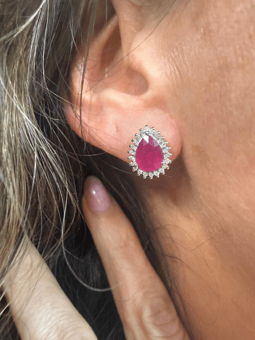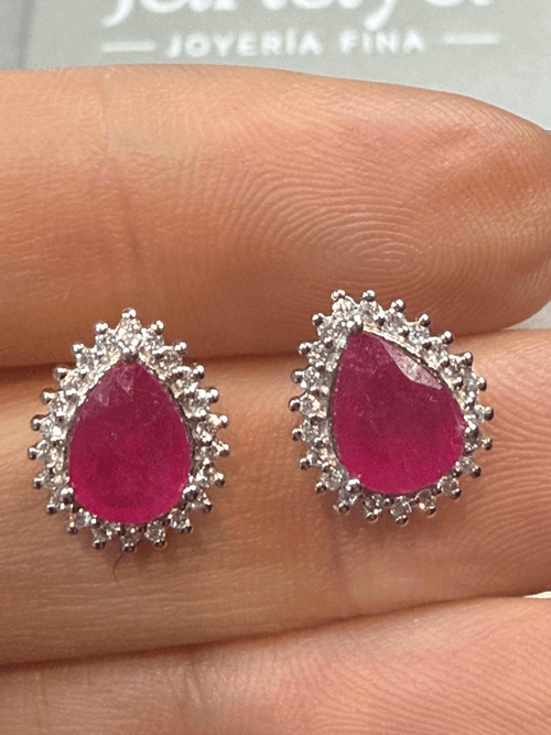Aretes tipo stud con rubí natural en corte pera, rodeado por un halo de diamantes naturales en corte brillante que realzan su intensidad y profundidad.