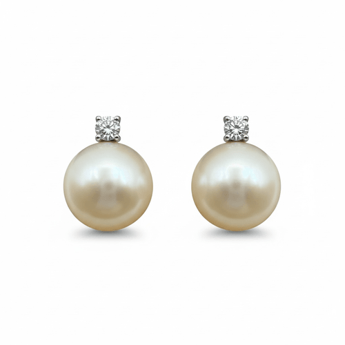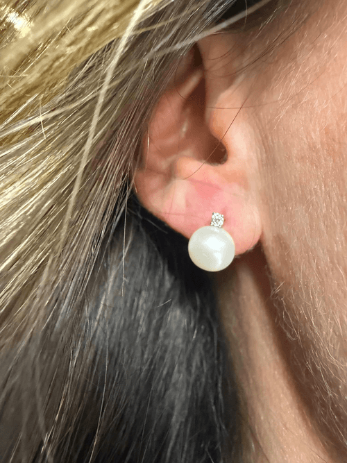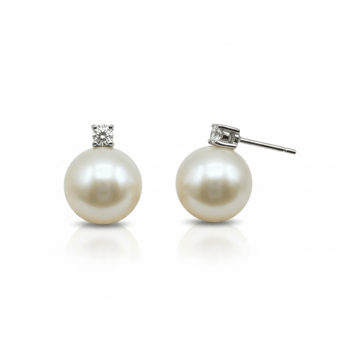 retes tipo stud elaborados en oro blanco 14K, protagonizados por una perla redonda de excepcional lustre y superficie sedosa, coronada por un diamante natural corte brillante redondo montado en cuatro garras.