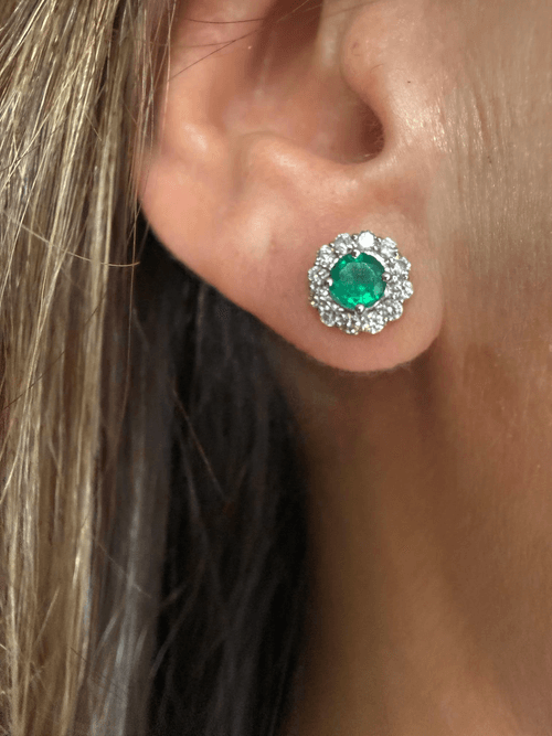 Aretes tipo stud elaborados en oro blanco, con una esmeralda natural de intenso tono verde en corte redondo, asegurada con cuatro garras clásicas que realzan su brillo y profundidad.