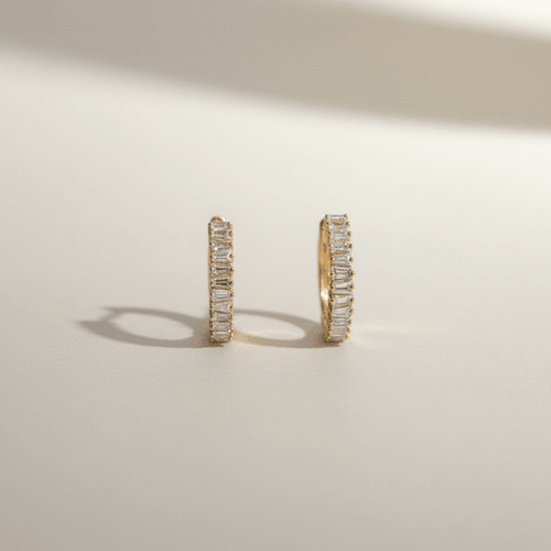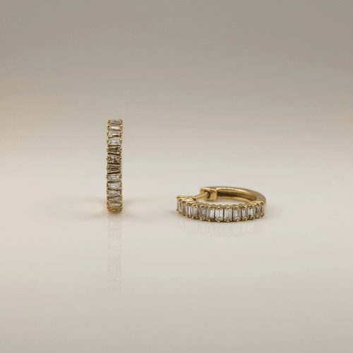 Arracadas en oro amarillo engastadas con una hilera continua de diamantes corte baguette dispuestos en línea vertical, creando un efecto de luz limpia y sofisticada.