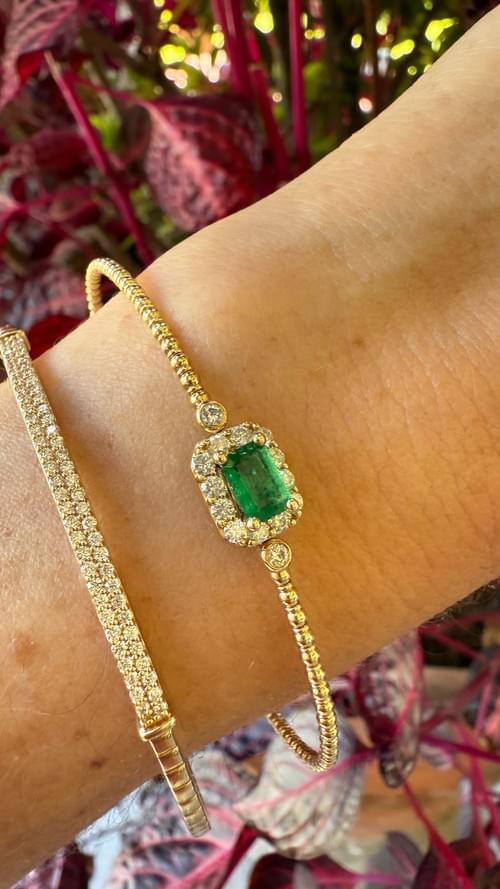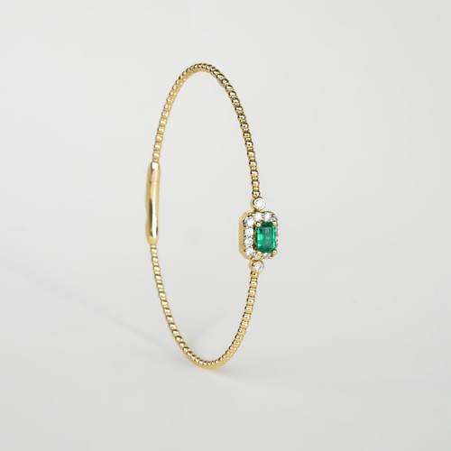 Un brazalete de oro amarillo con beads de oro que destaca por su diseño delicado y elegante. Al centro, una esmeralda corte esmeralda (emerald cut) en un tono verde intenso, enmarcada por un halo de diamantes redondos que realzan su brillo natural. El detalle de diamantes adicionales en la parte superior e inferior añade un toque de lujo y sofisticación.