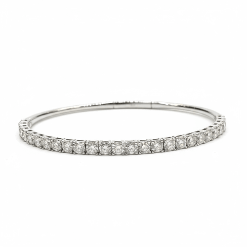 Un brazalete tipo tennis elaborado en oro blanco de 14 quilates, engastado con una hilera continua de diamantes corte brillante redondo. Cada piedra refleja una luminosidad impecable, creando un destello elegante y sofisticado que envuelve la muñeca con armonía y movimiento. Ideal para realzar cualquier look con un toque de lujo atemporal.