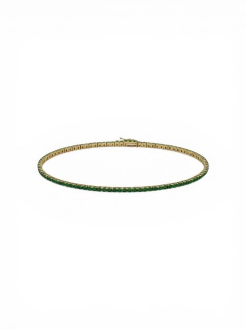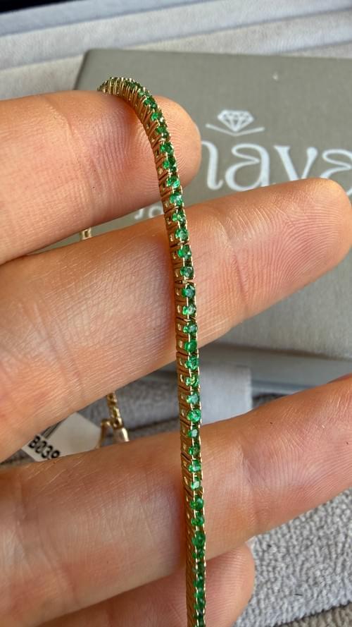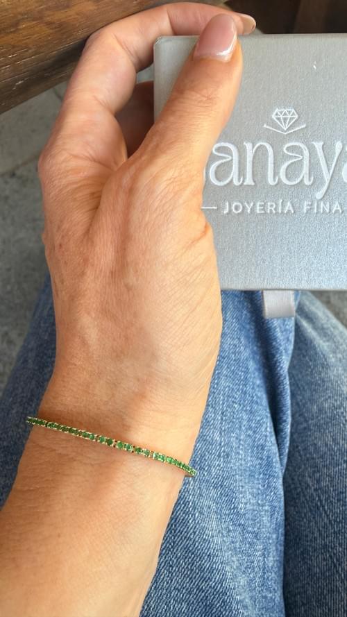 Elegante brazalete tipo tennis elaborado en oro amarillo, engastado con una línea continua de esmeraldas naturales en corte redondo. Su diseño delicado y flexible resalta el brillo y la intensidad del verde, creando una pieza sofisticada y atemporal, perfecta para uso diario o para elevar cualquier look con un toque de lujo sutil.