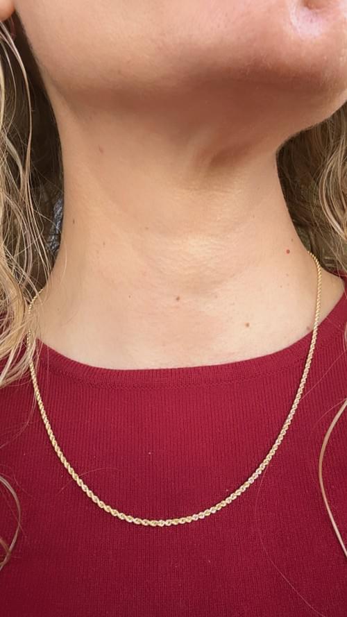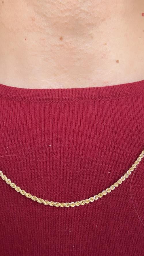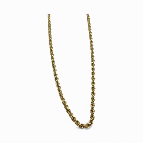 Cadena de oro amarillo de 14 quilates con tejido torzal, caracterizado por su trenzado helicoidal que refleja la luz desde todos los ángulos. Su diseño entrelazado crea un efecto brillante y elegante, ideal para lucir sola como pieza protagonista o para combinar con dijes delicados. Un básico de alta joyería que nunca pasa de moda.
