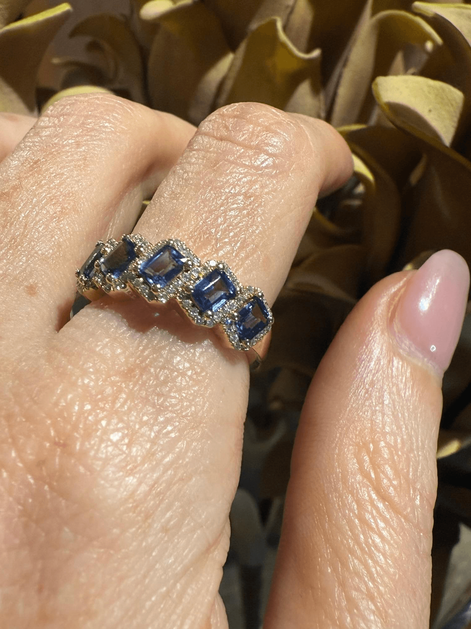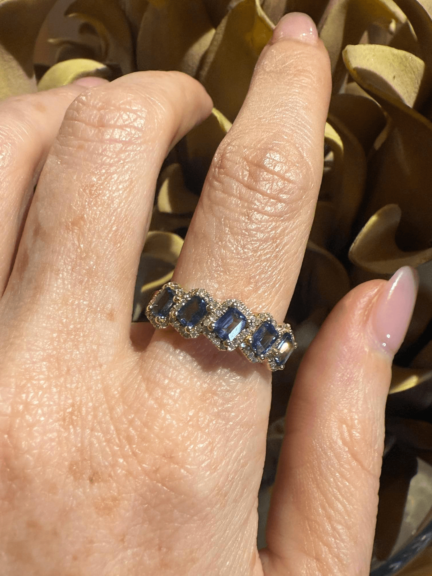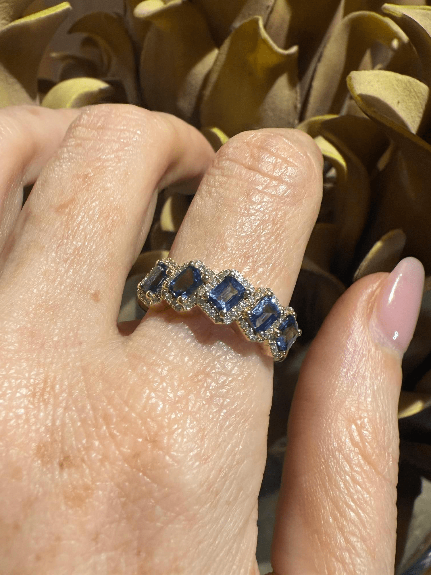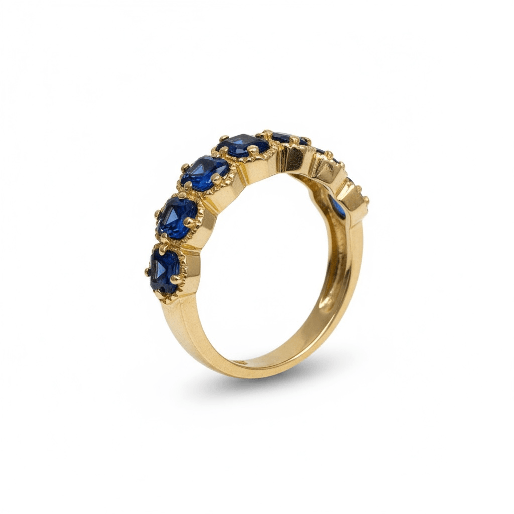 Un diseño elegante y perfectamente equilibrado que combina el brillo del oro amarillo con la profundidad del azul. Este anillo presenta una secuencia de zafiros corte esmeralda, cada uno enmarcado por un halo de diminutos diamantes que realzan su resplandor. La disposición continua de las gemas crea un efecto rítmico y sofisticado, ideal para quien busca una pieza con carácter y armonía visual.