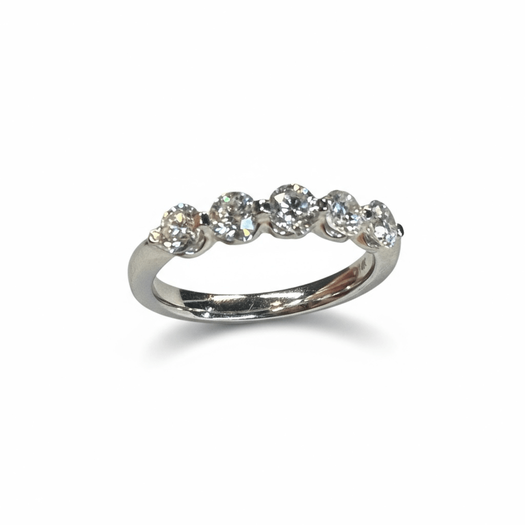Una churumbela de diamantes que celebra la pureza del brillo eterno. Forjada en oro blanco de 14K, presenta cinco diamantes corte brillante redondo, cada uno cuidadosamente engastado en un diseño abierto que permite el máximo paso de luz. Su estructura elegante y moderna crea un efecto de destellos continuos, perfecto tanto para acompañar un anillo solitario como para lucirse sola en su sofisticada simplicidad.